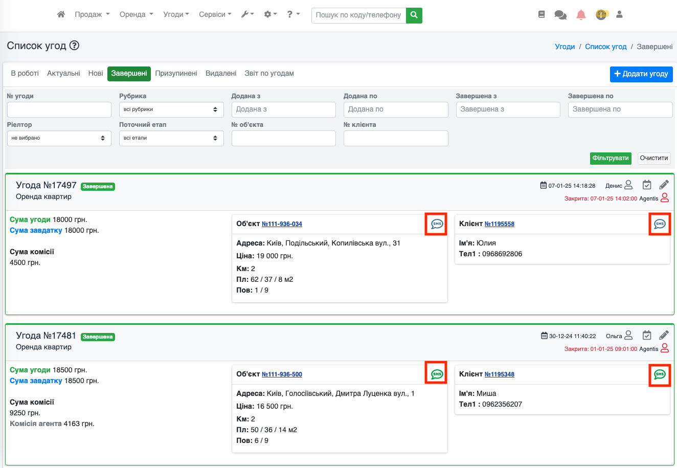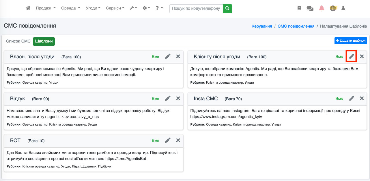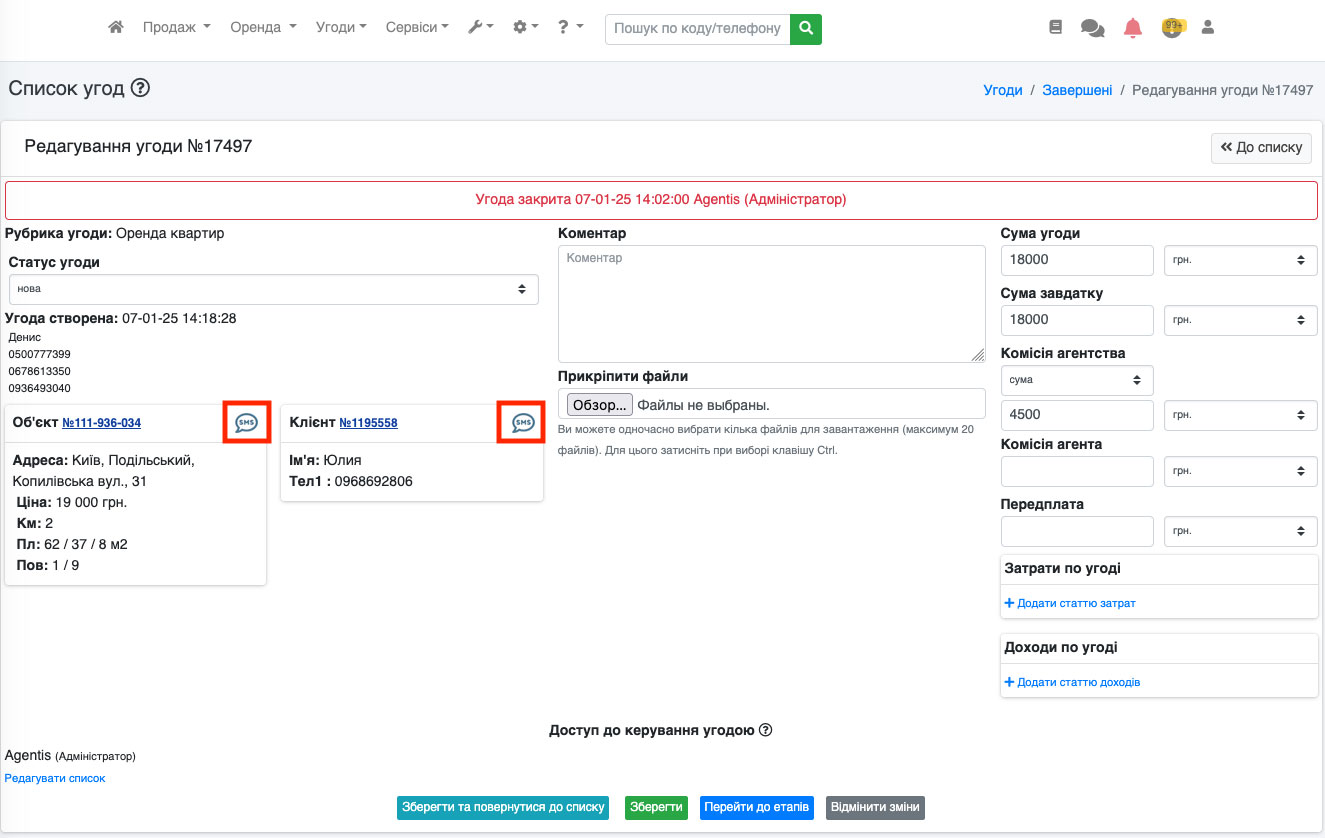 Також кнопка «SMS» доступна і в редагуванні угоди. Для цього перейдіть до редагування угоди (Рис. 1558).