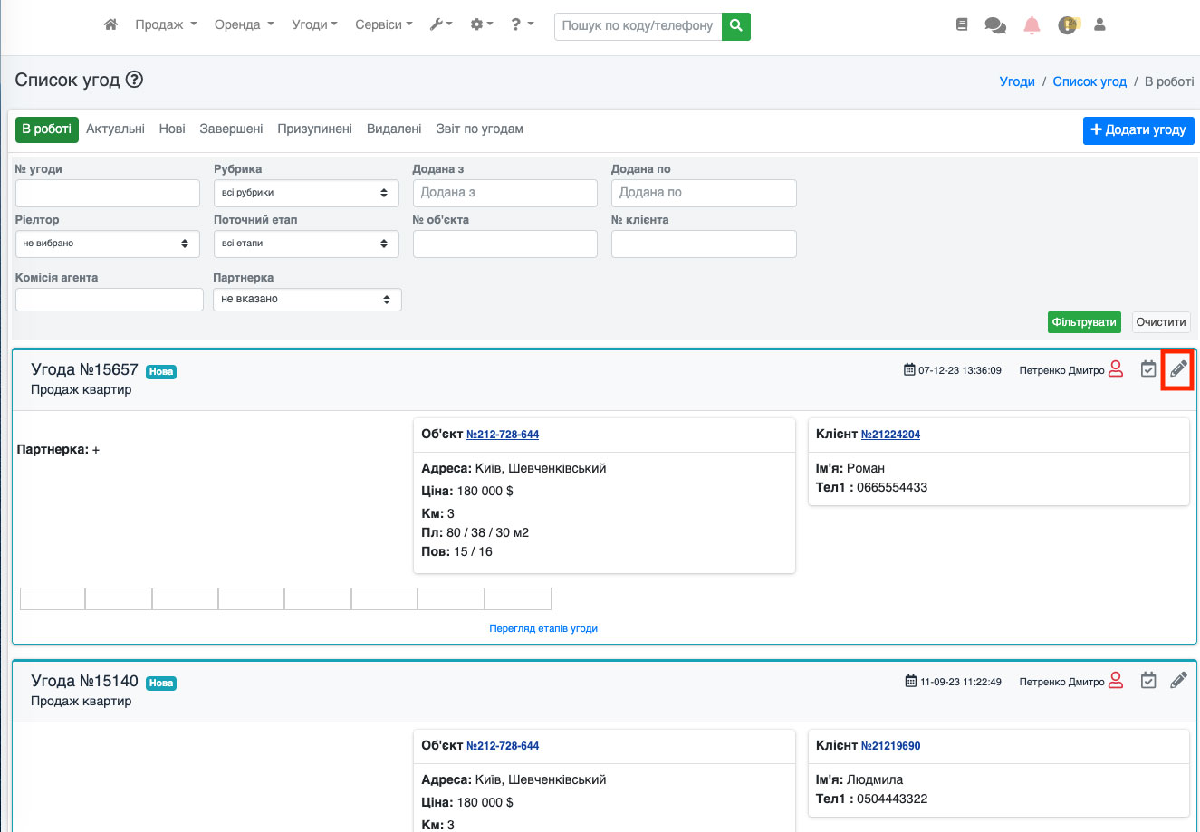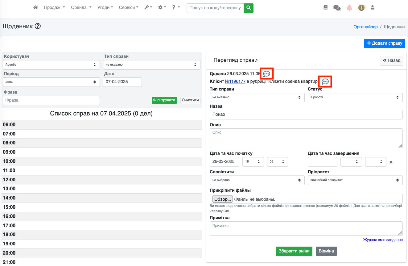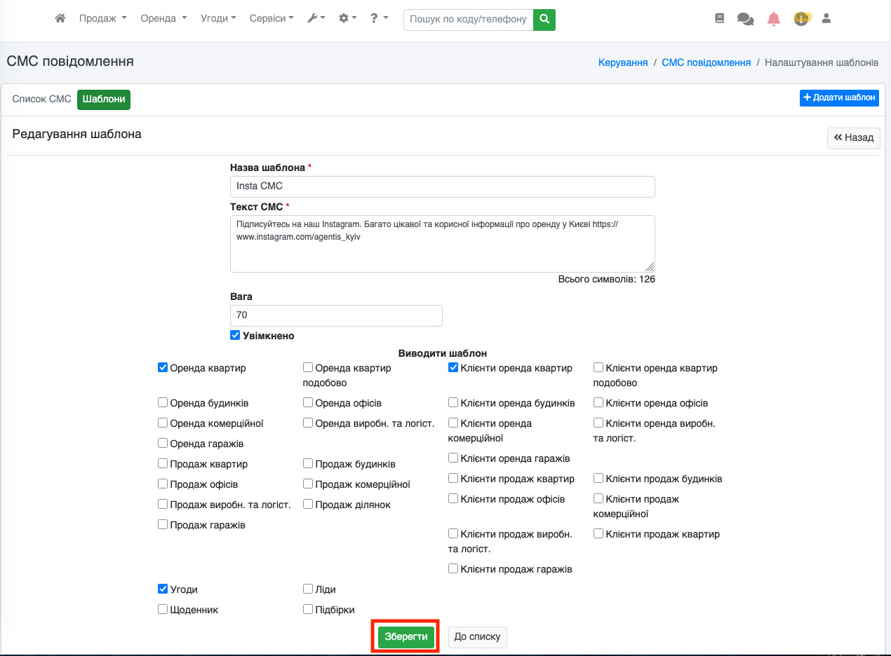 Також кнопка «SMS» доступна і в редагуванні угоди. Для цього перейдіть до редагування угоди (Рис. 1558).