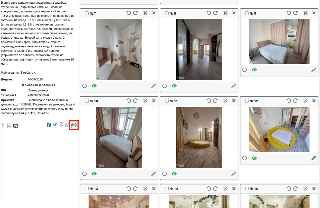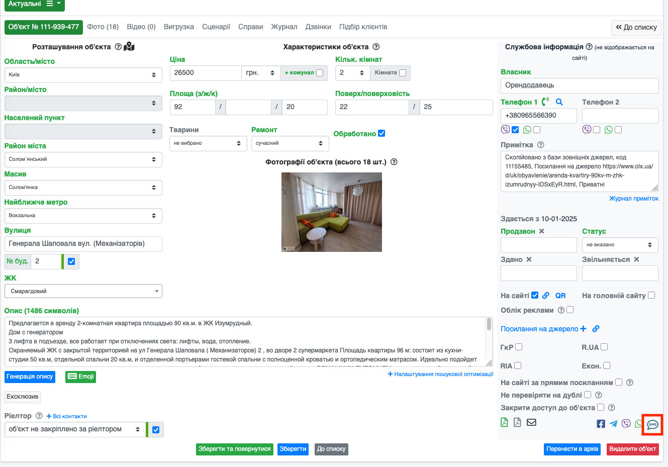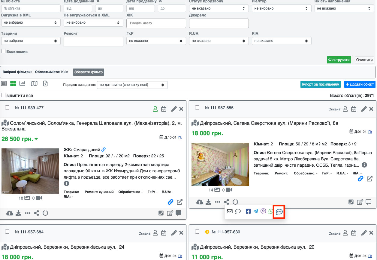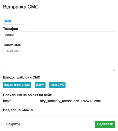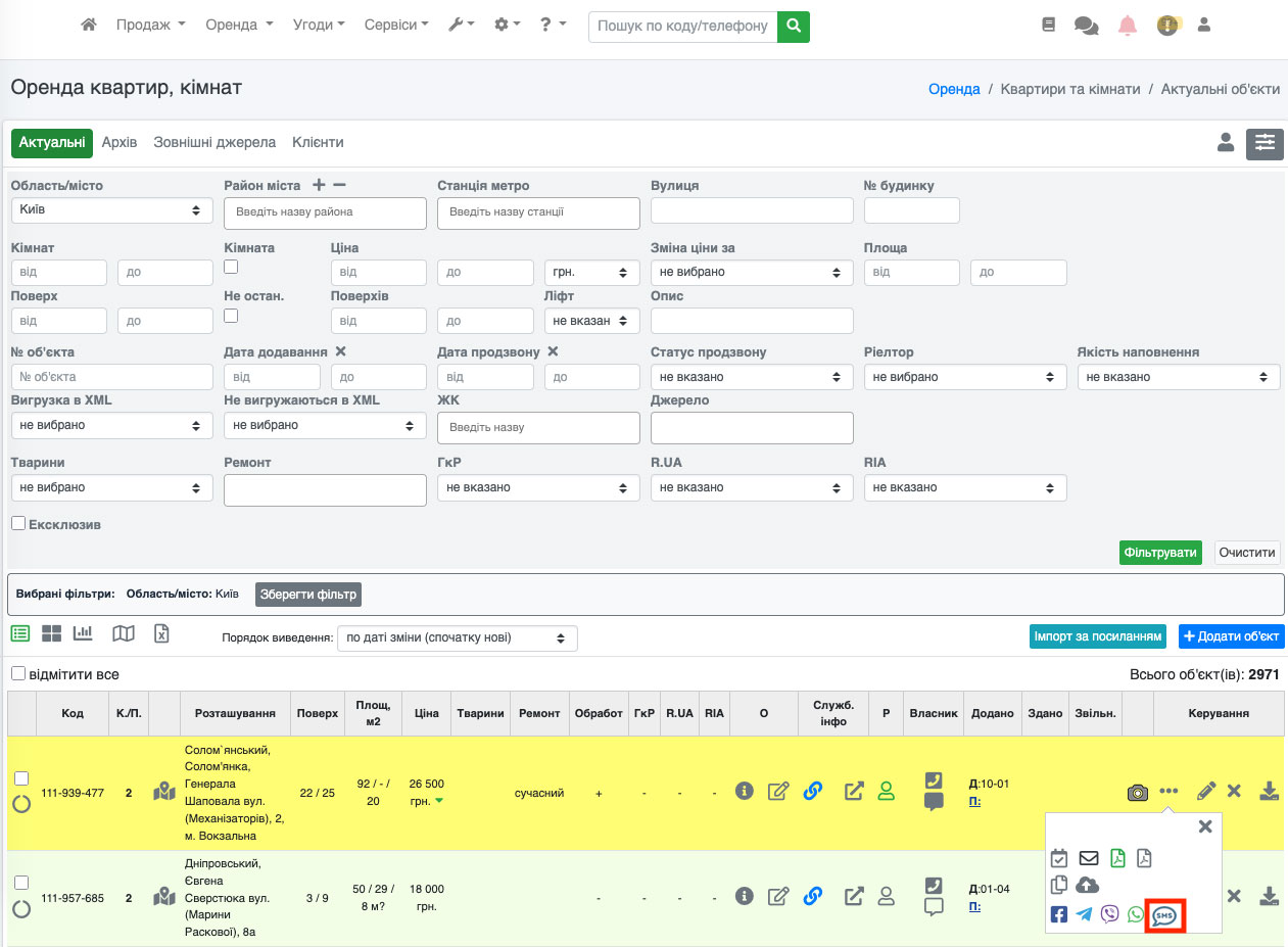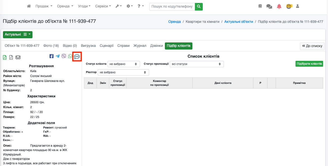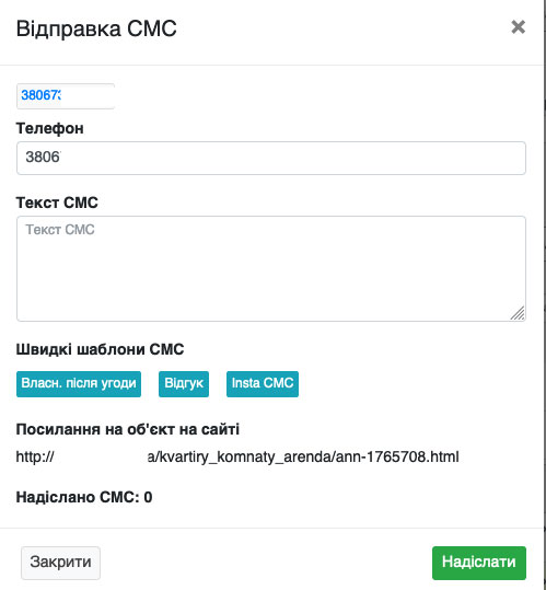 На сторінці, що відкрилася, біля коду об'єкта буде кнопка «SMS» (Рис. 1559), натиснувши на яку Ви зможете теж відправляти смс повідомлення.