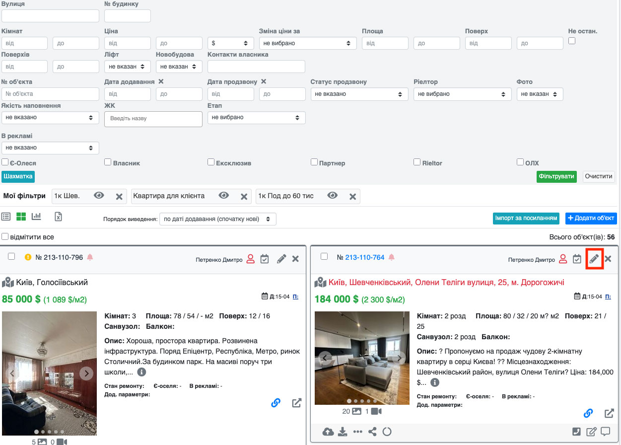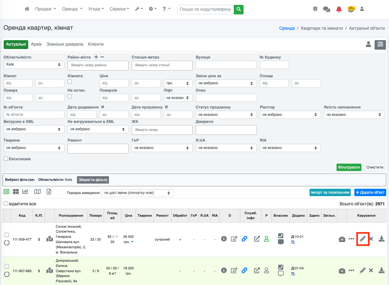 Перейдіть до редагування об'єкта. Для цього натисніть іконку «Олівець» на потрібному об'єкті (Рис. 1528, Рис. 1529).