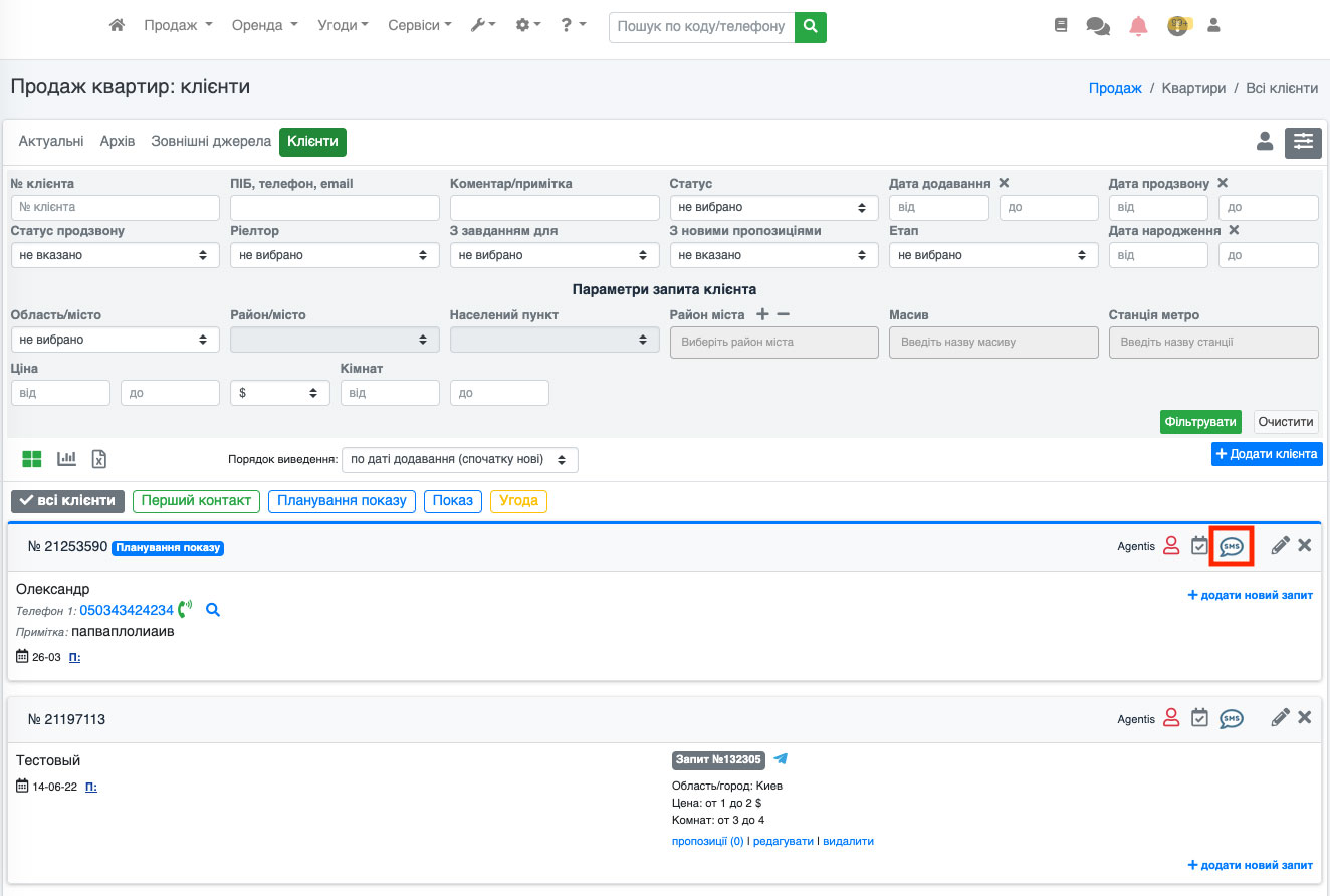 Перейдіть до списку клієнтів і знайдіть іконку SMS (Рис. 1535).