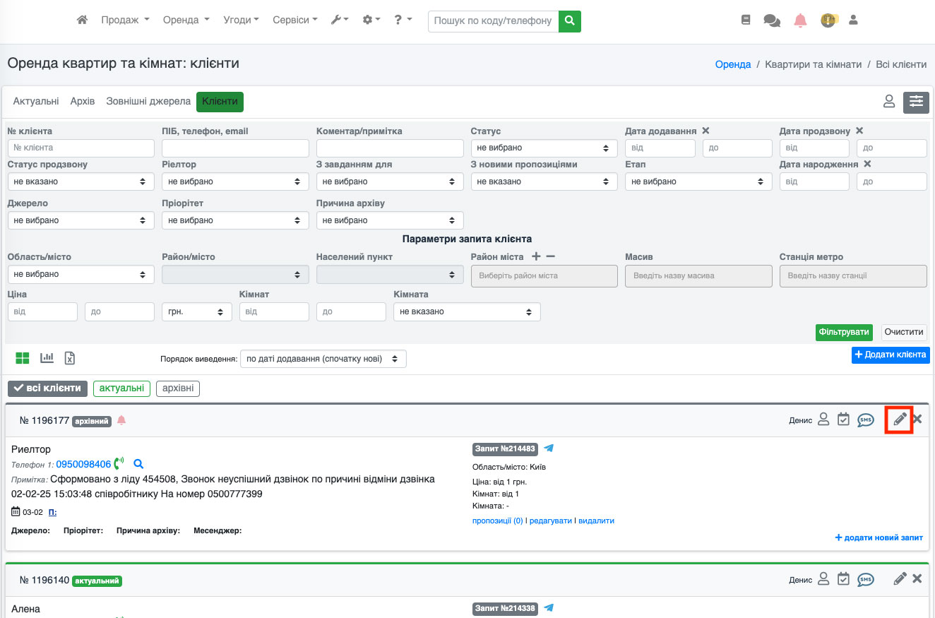 Перейдіть до редагування клієнта. Для цього натисніть іконку «Олівець» на потрібному клієнті (Рис. 1538).