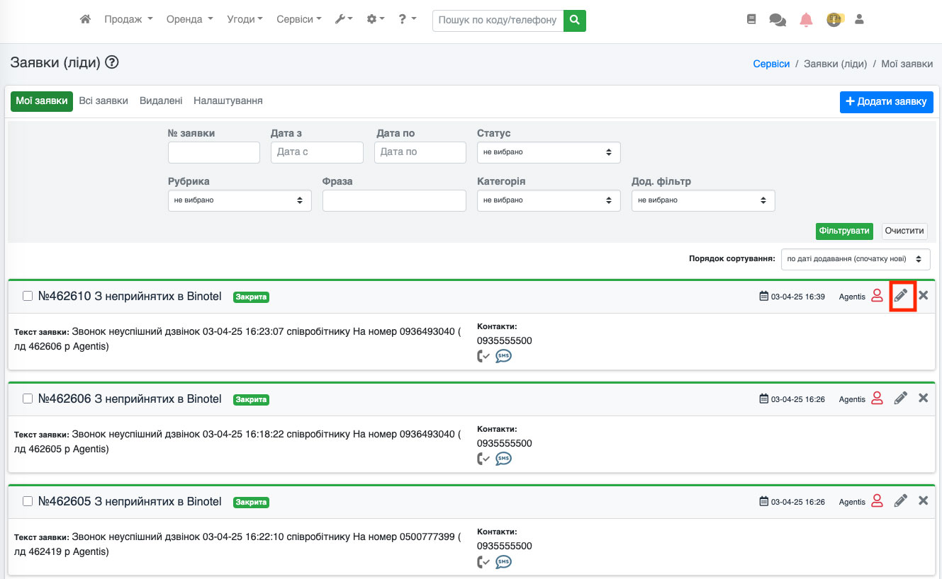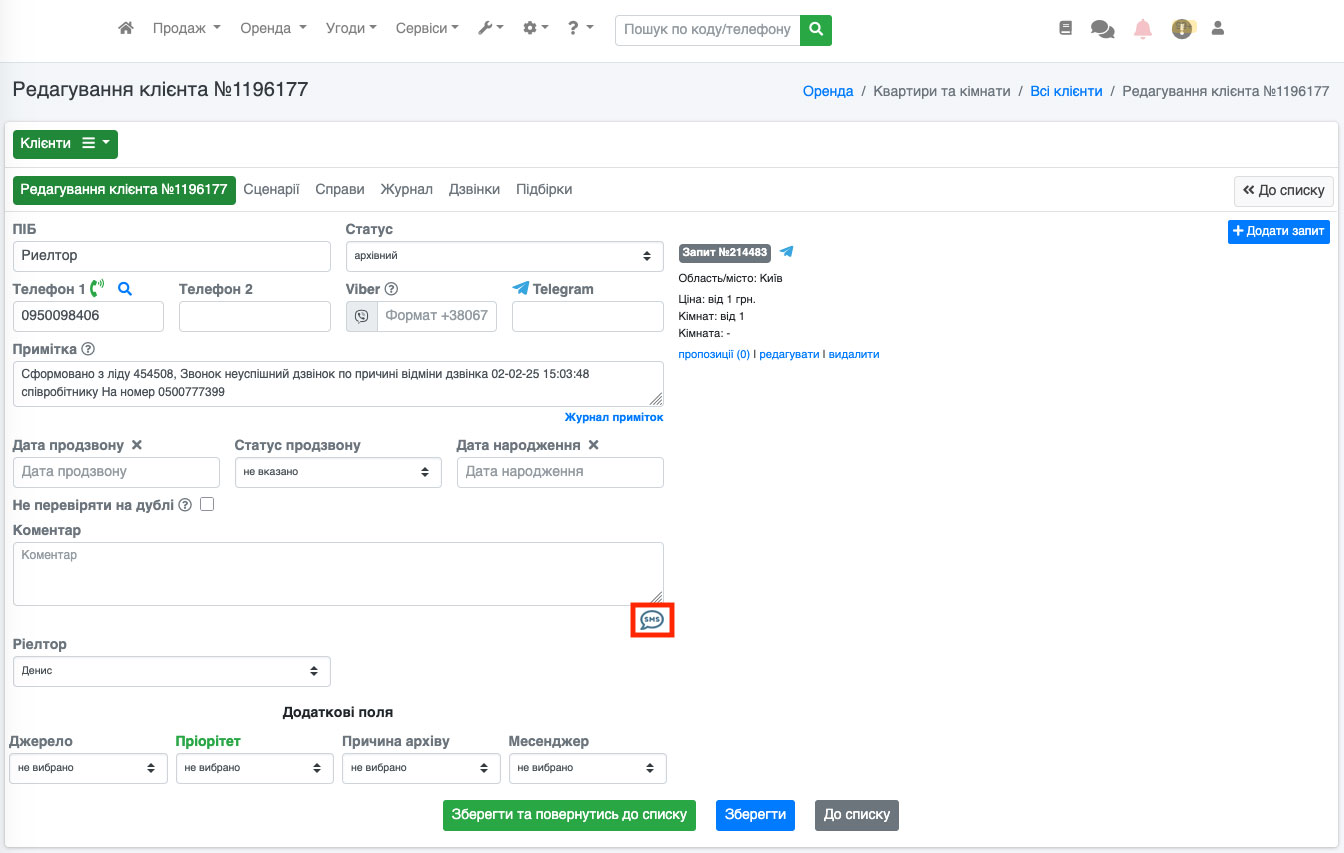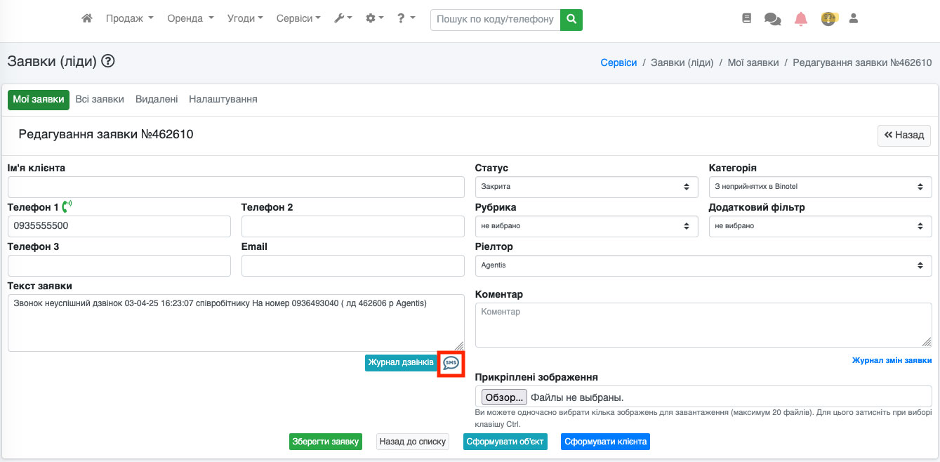 Також кнопка «SMS» доступна і в картці заявки/ліда. Для цього перейдіть до редагування заявки/ліда (Рис. 1546).