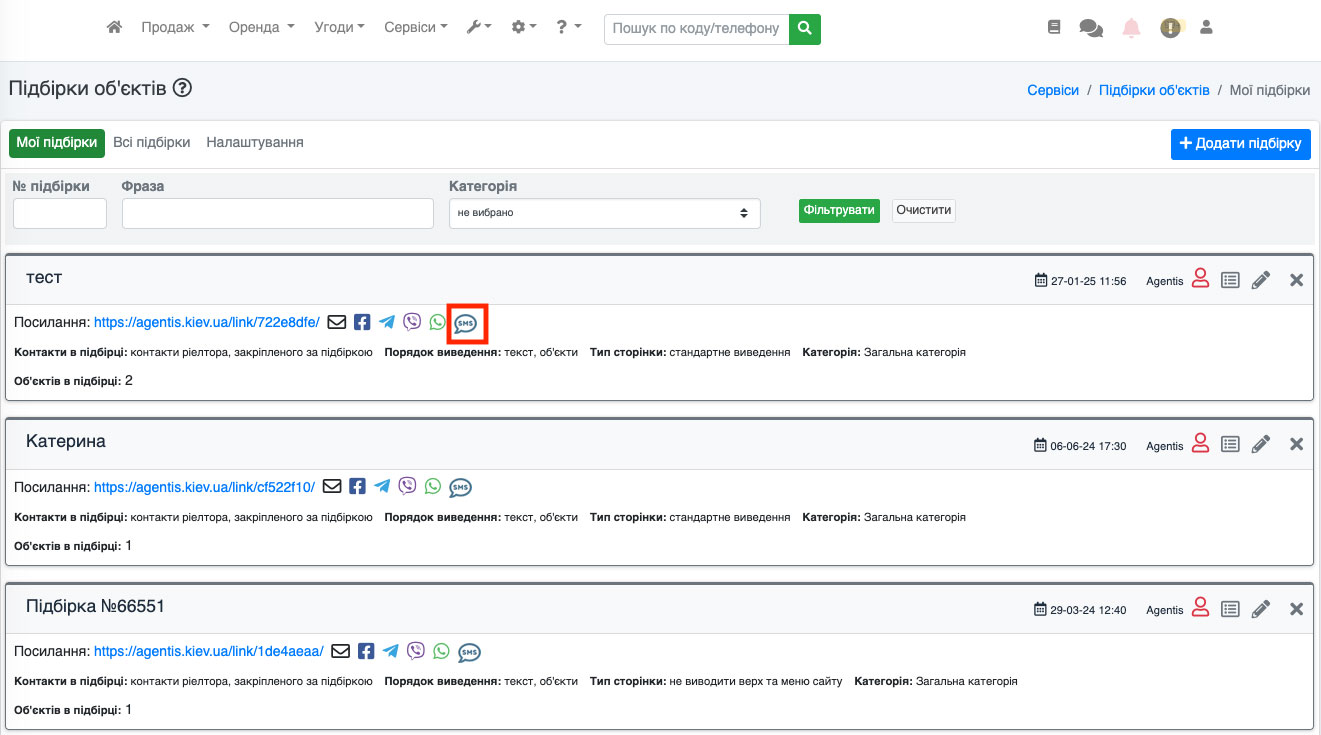 На сторінці, що відкрилася, навпроти кожної підбірки буде відображатися кнопку «SMS», натисніть на кнопку відправки смс біля потрібної підбірки (Рис. 1549).