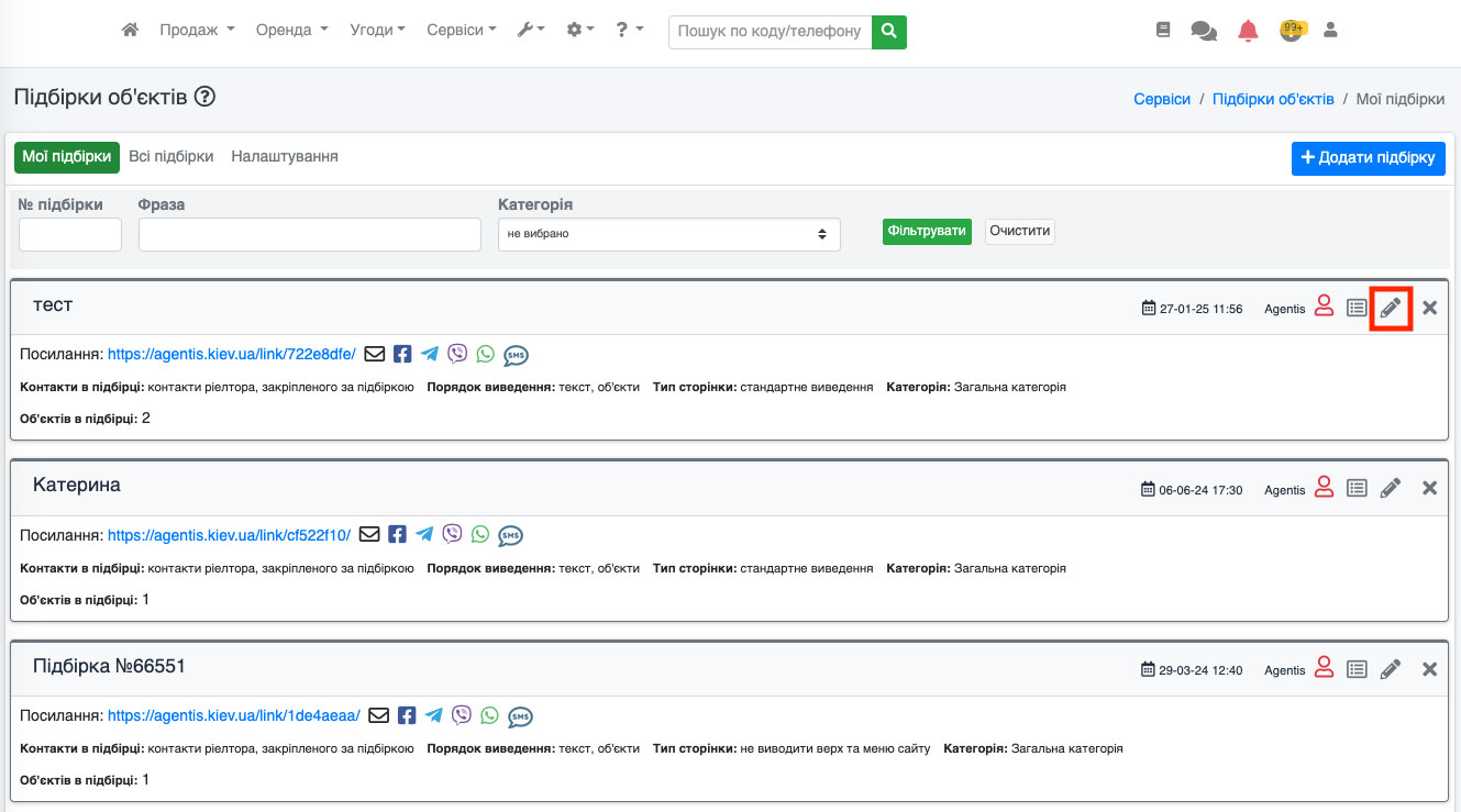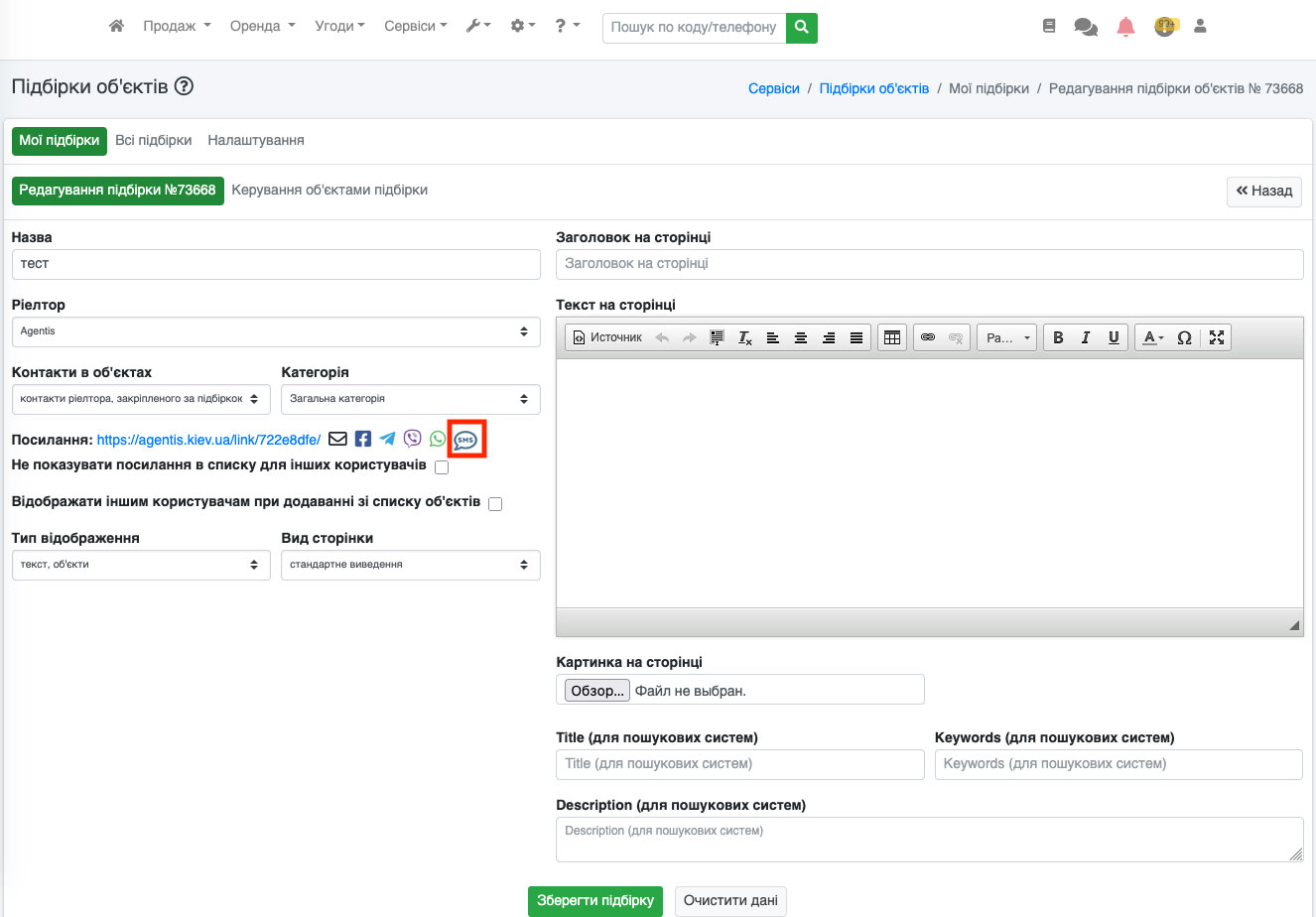 Також кнопка «SMS» доступна і для редагування підбірки. Для цього перейдіть до редагування підбірки (Рис. 1552).