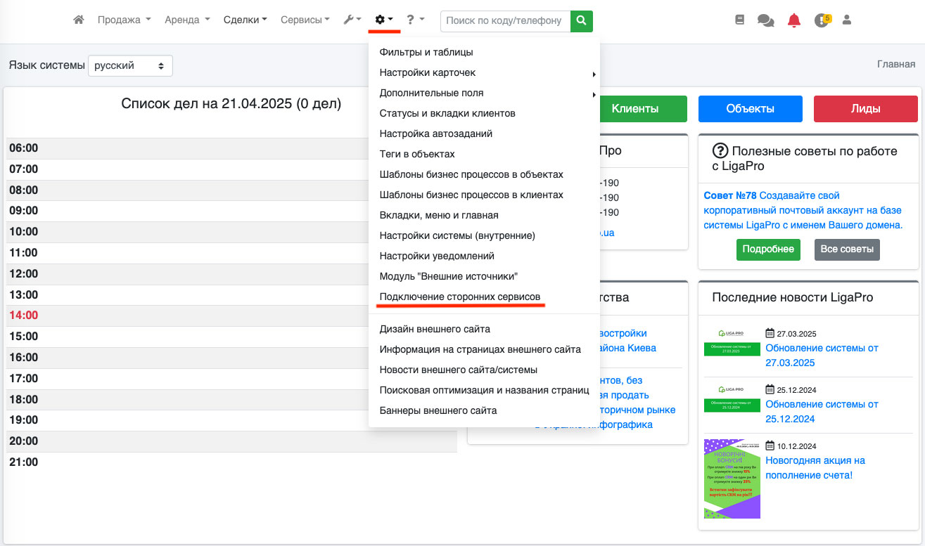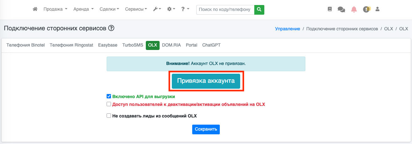 В системе ЛигаПро существует возможность привязать свой аккаунт на OLX прямо к ЛигаПро. Чтобы привязать аккаунт перейдите в пункт «Управление – Подключение сторонних сервисов» (Рис. 1603).
