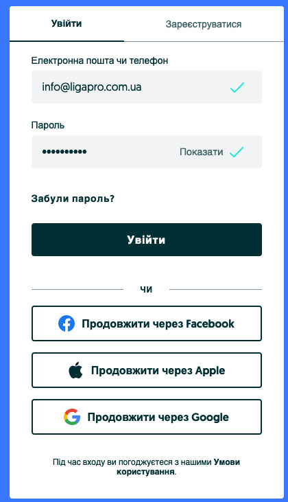 У Вас откроется диалоговое окно ОЛХ с формой предоставления доступа к аккаунту компании ЛигаПро, если Вы не авторизированны на ОЛХ, то появится окно авторизации (Рис. 1605).