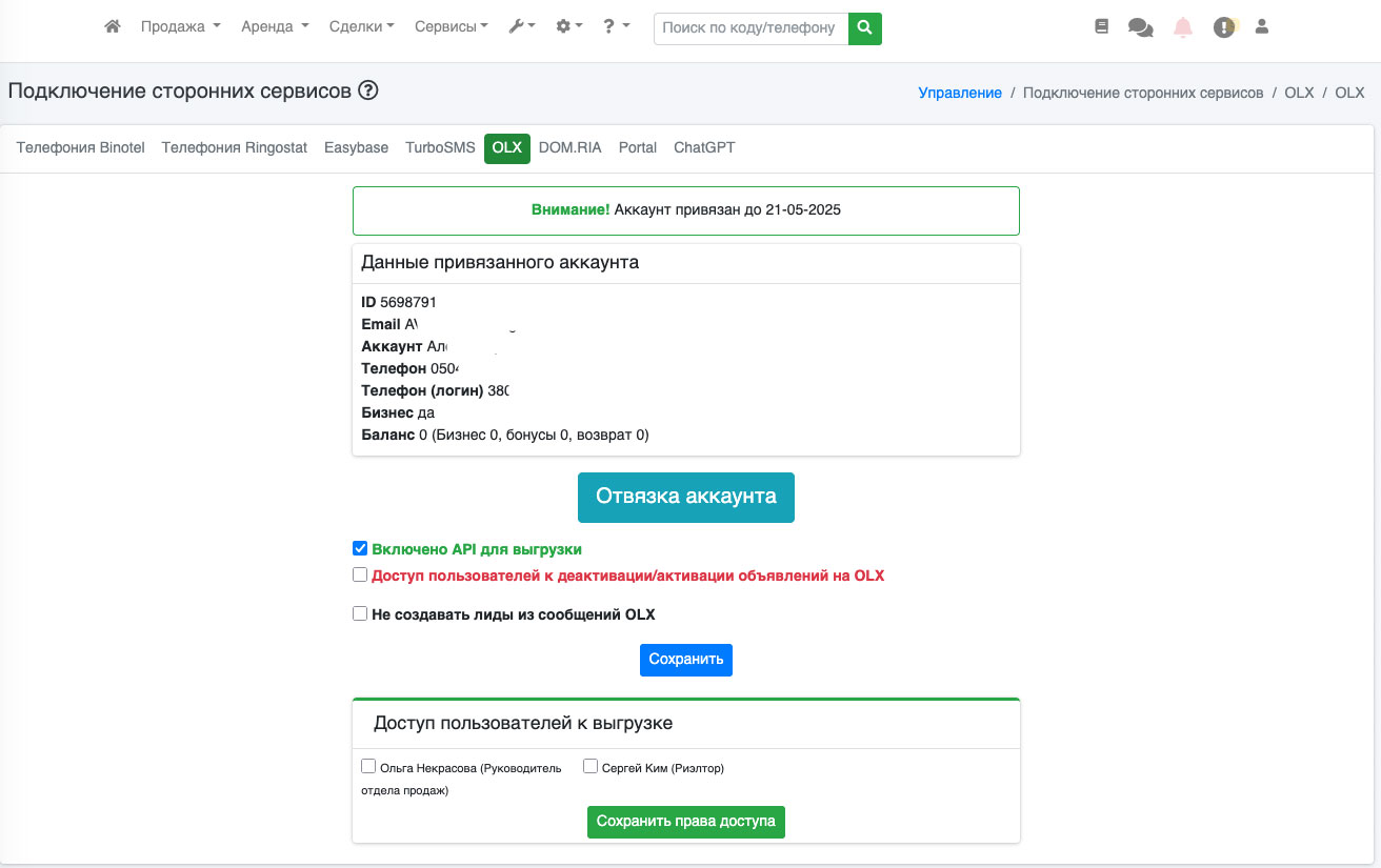 Нажмите на кнопку «Предоставить доступ», после чего аккаунт будет привязан к ОЛХ (Рис. 1606).