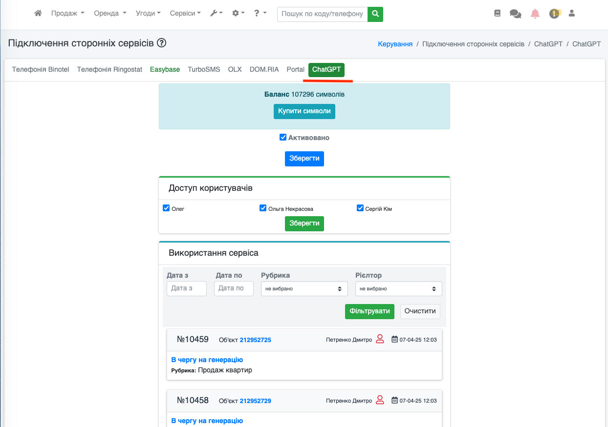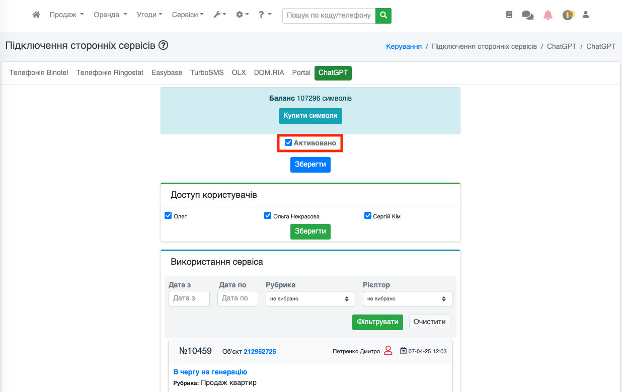 На вкладці ChatGPT поставте галочку «Ввімкнено» та натисніть синю кнопку «Зберегти» (Рис. 1611).