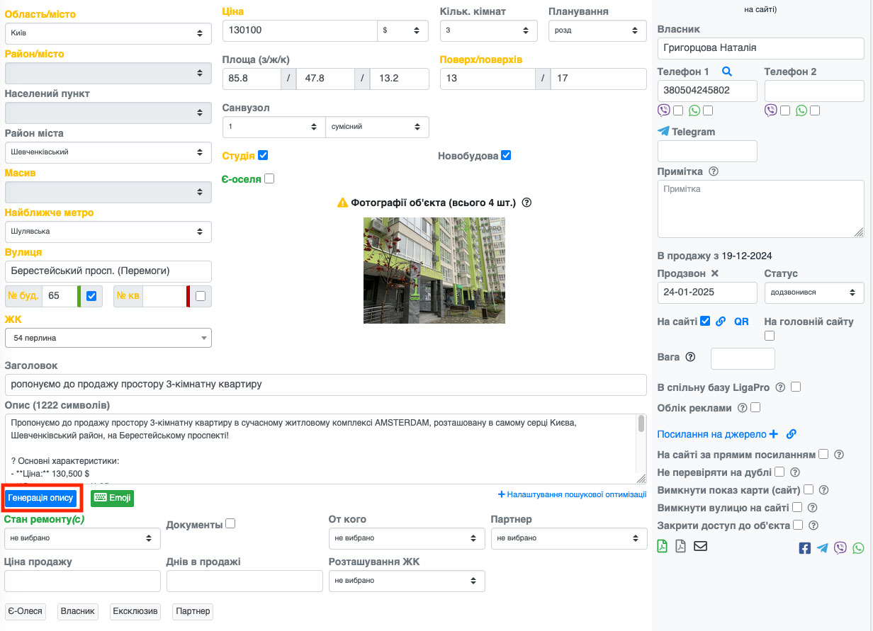 Якщо ви все зробили правильно, ChatGPT буде активовано, і на сторінці редагування об'єкта під описом у вас з'явиться кнопка «Генерація опису» (Рис. 1612).