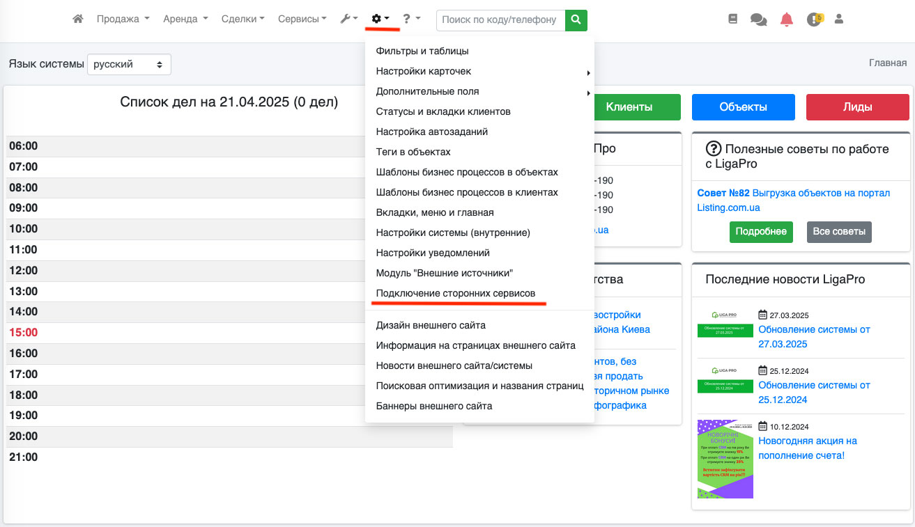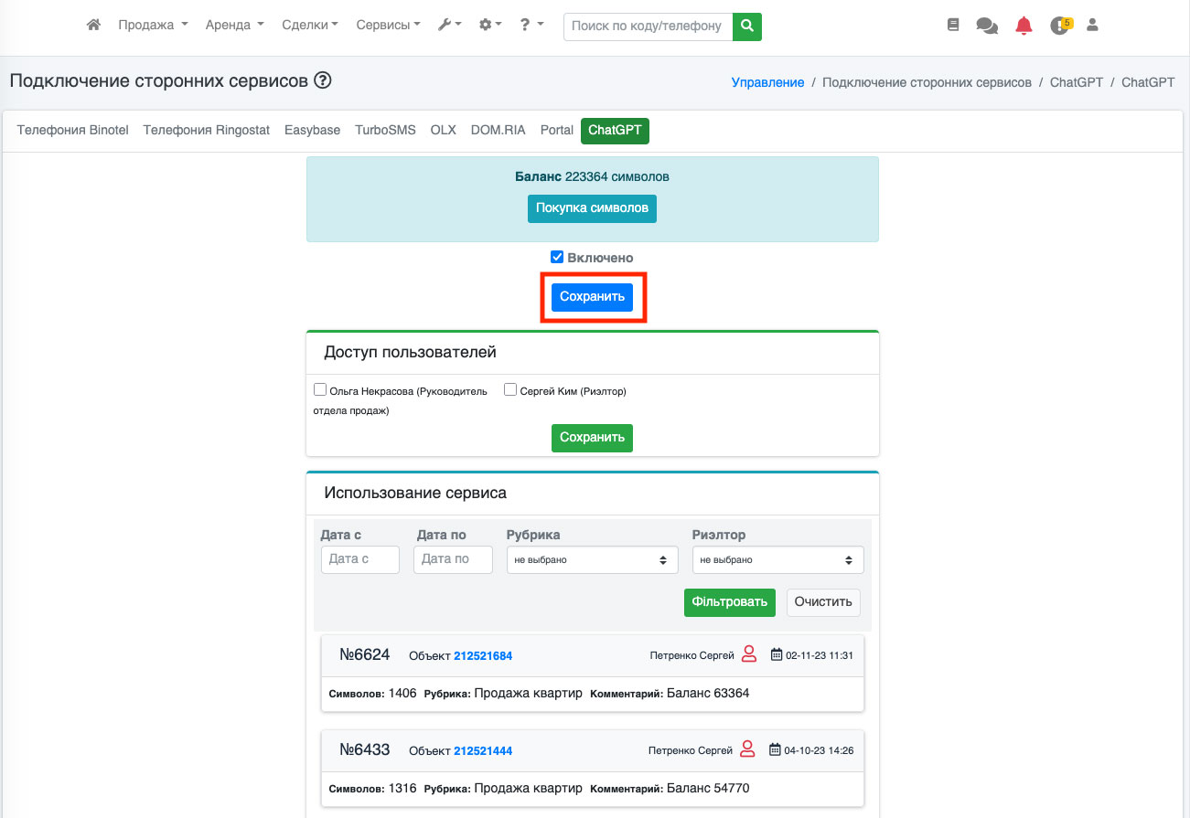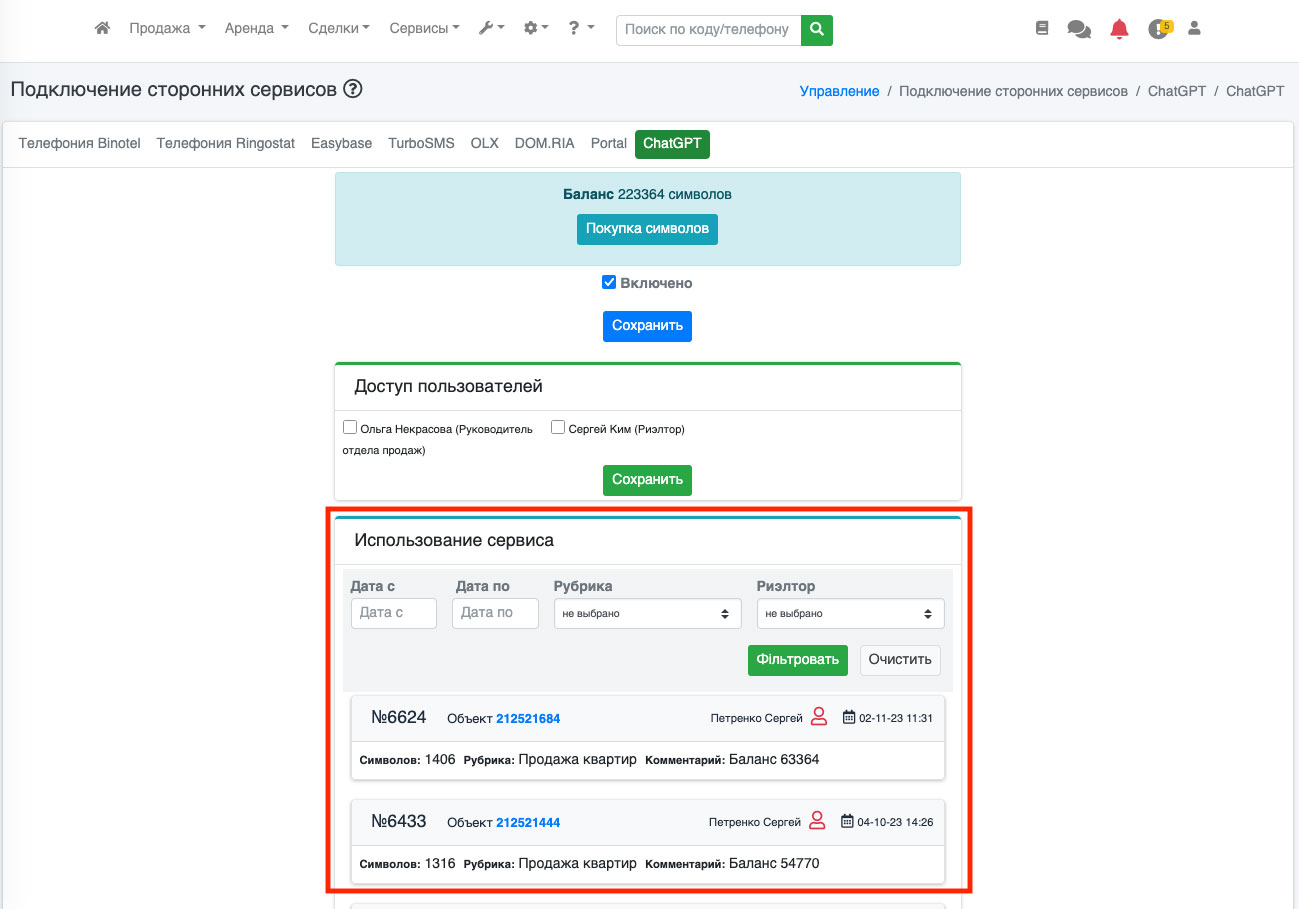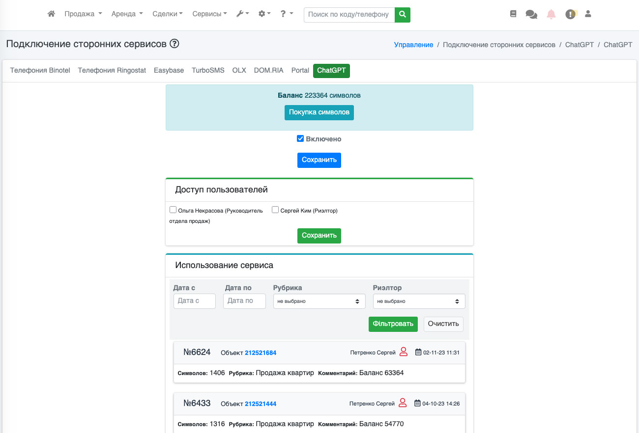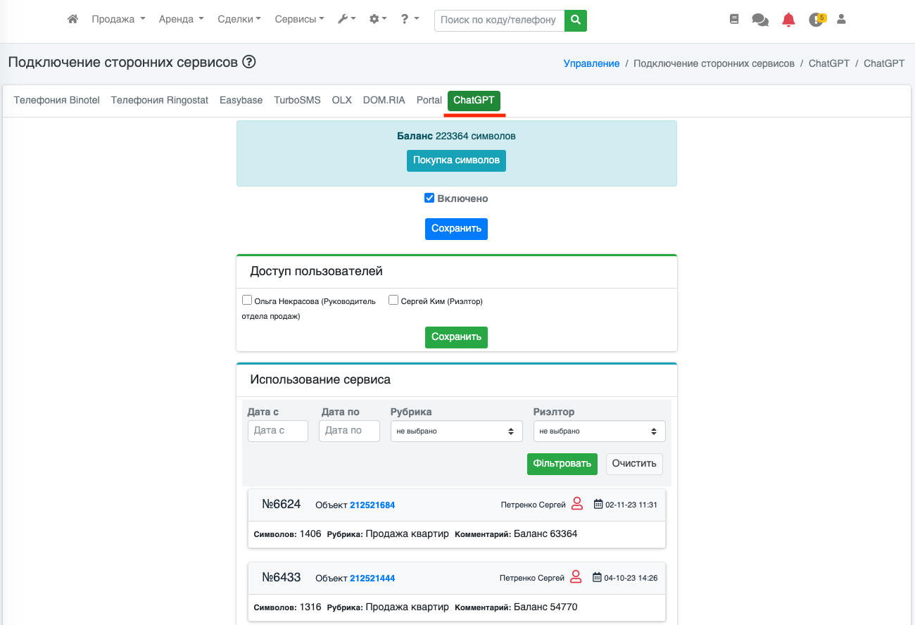 Для учета и контроля рассходов предусмотрена возможность отслеживать сколько и когда символов было использовано и каким риелтором. Для этого перейдите в пункт «Настройки – Подключение сторонних сервисов» (Рис. 1641).