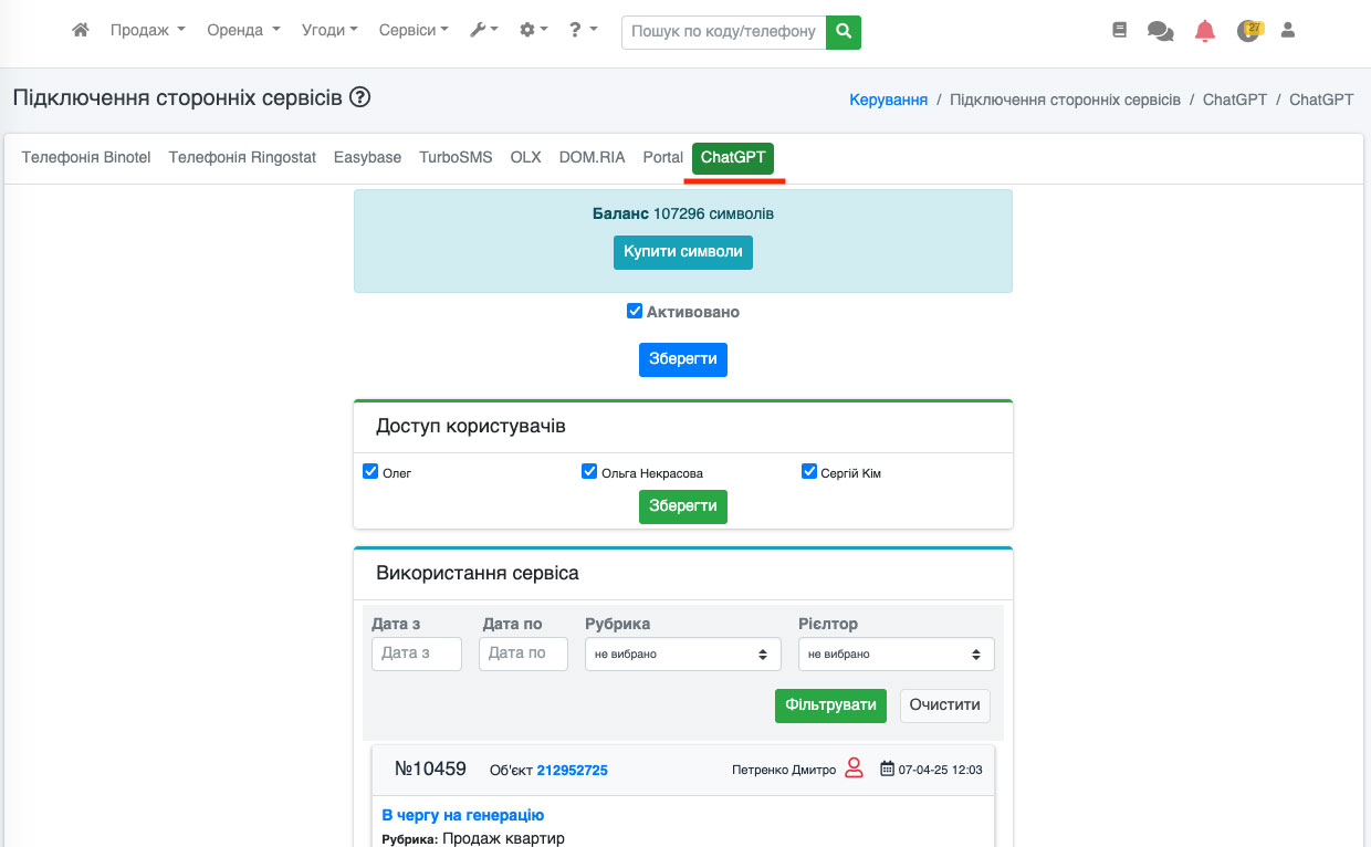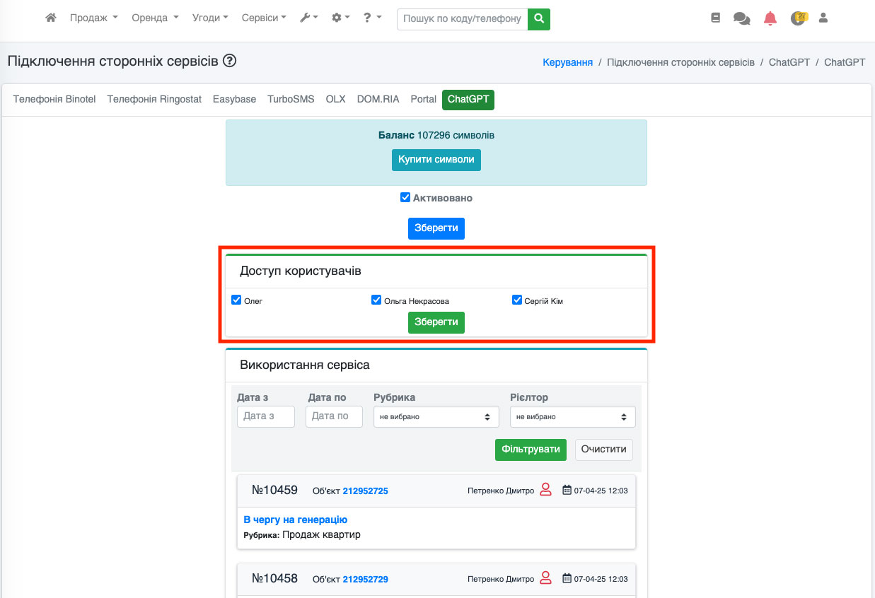 На вкладці ChatGPT Ви побачите список користувачів Вашого облікового запису. Поставте галочку біля користувачів, яким Ви бажаєте надати доступ і натисніть зелену кнопку «Зберегти» (Рис. 1622). Доступ співробітникам до створення описів буде відкритий.