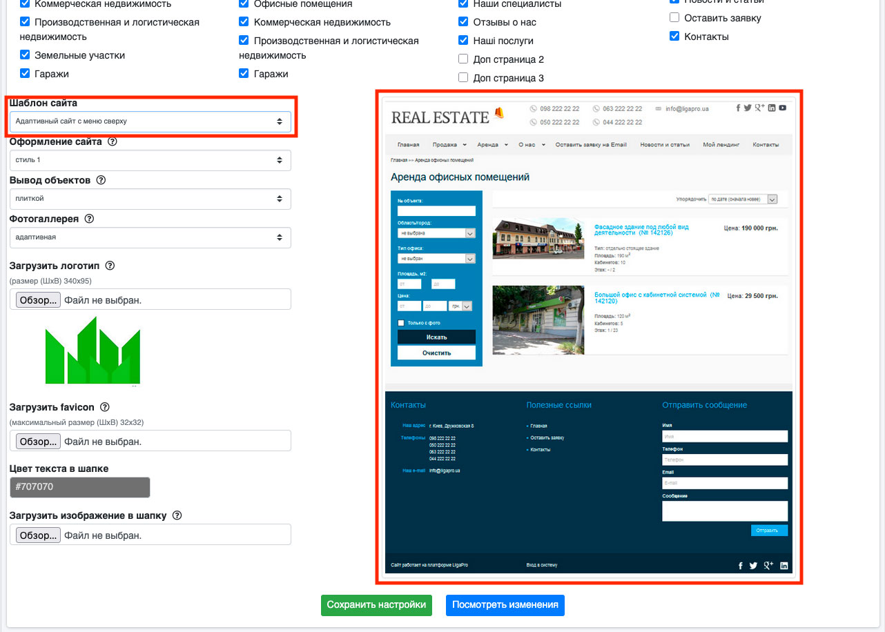 По умолчанию установлен шаблон «Адаптивный сайт с меню сверху».