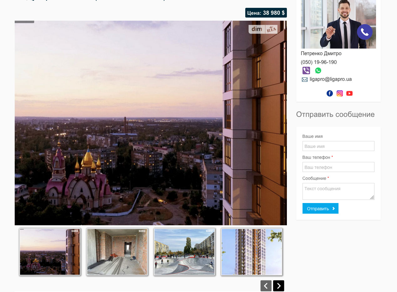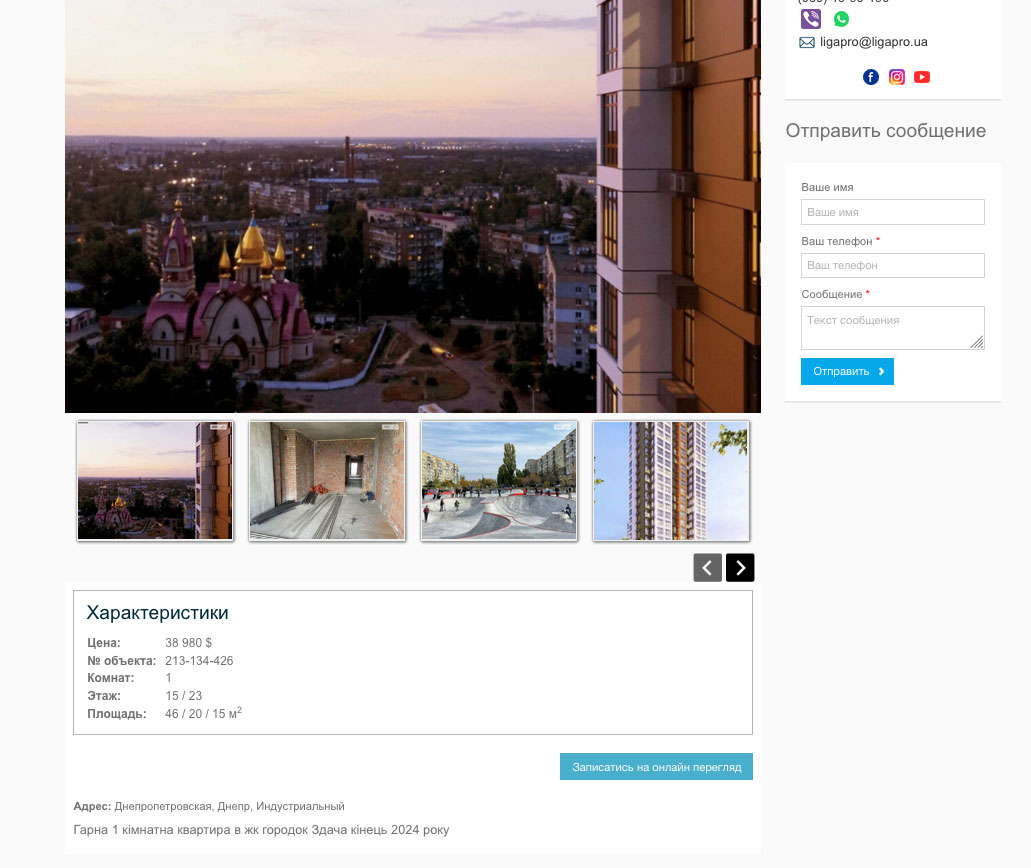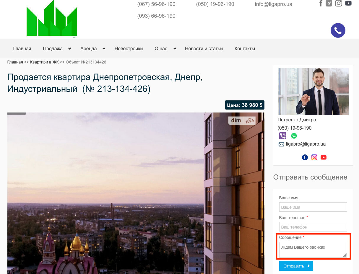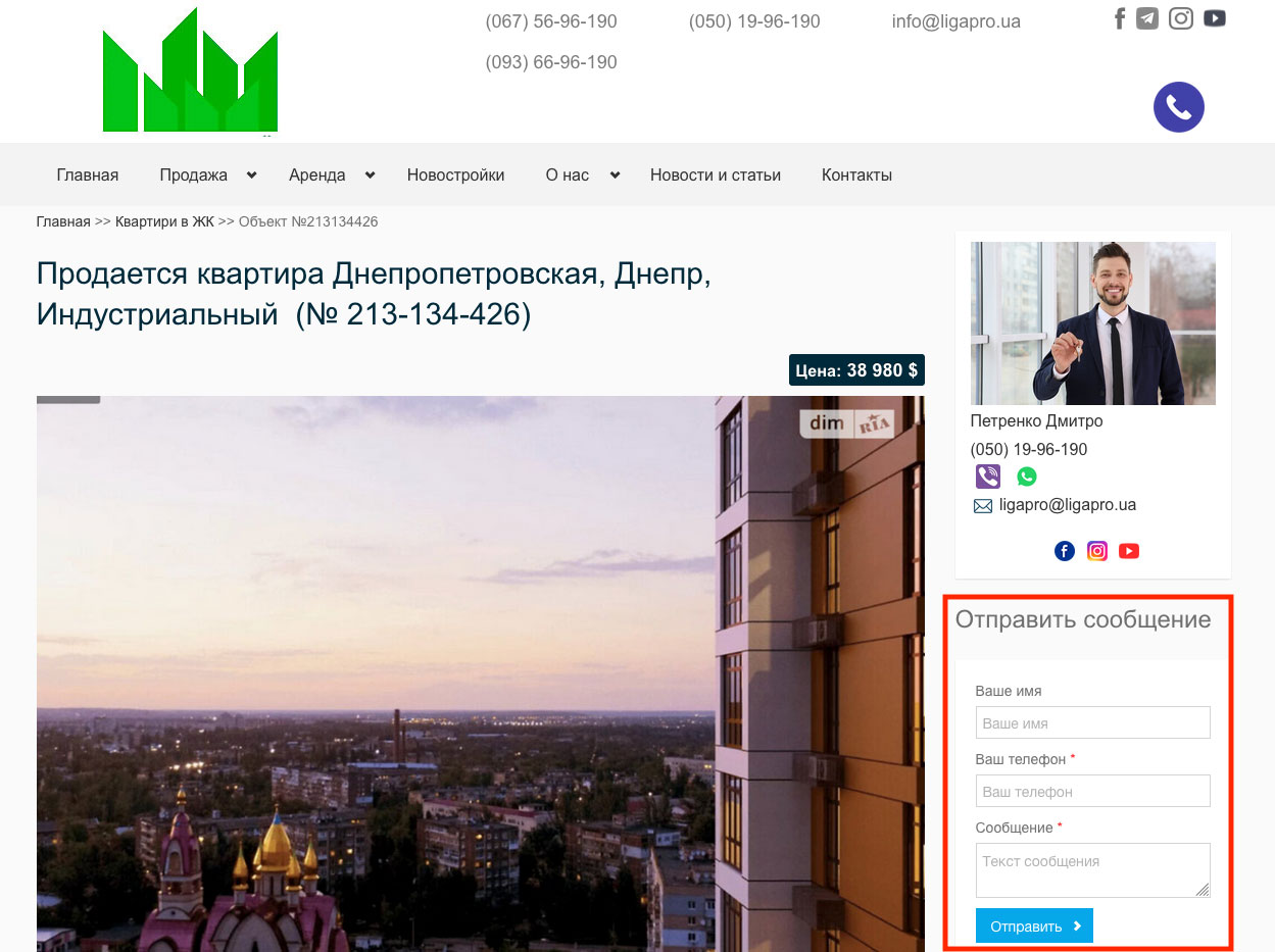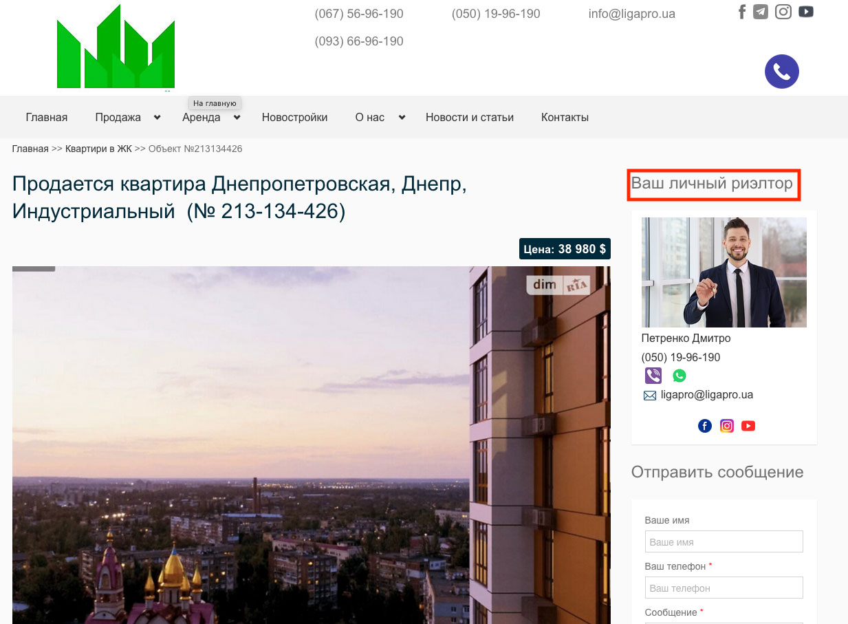 При детальном просмотре объекта, под контактами риэлтора, располагается форма отправки сообщения риэлтору (все эти заявки попадают в раздел «Заявки/Лиды» системы ЛигаПро) (Рис. 228).