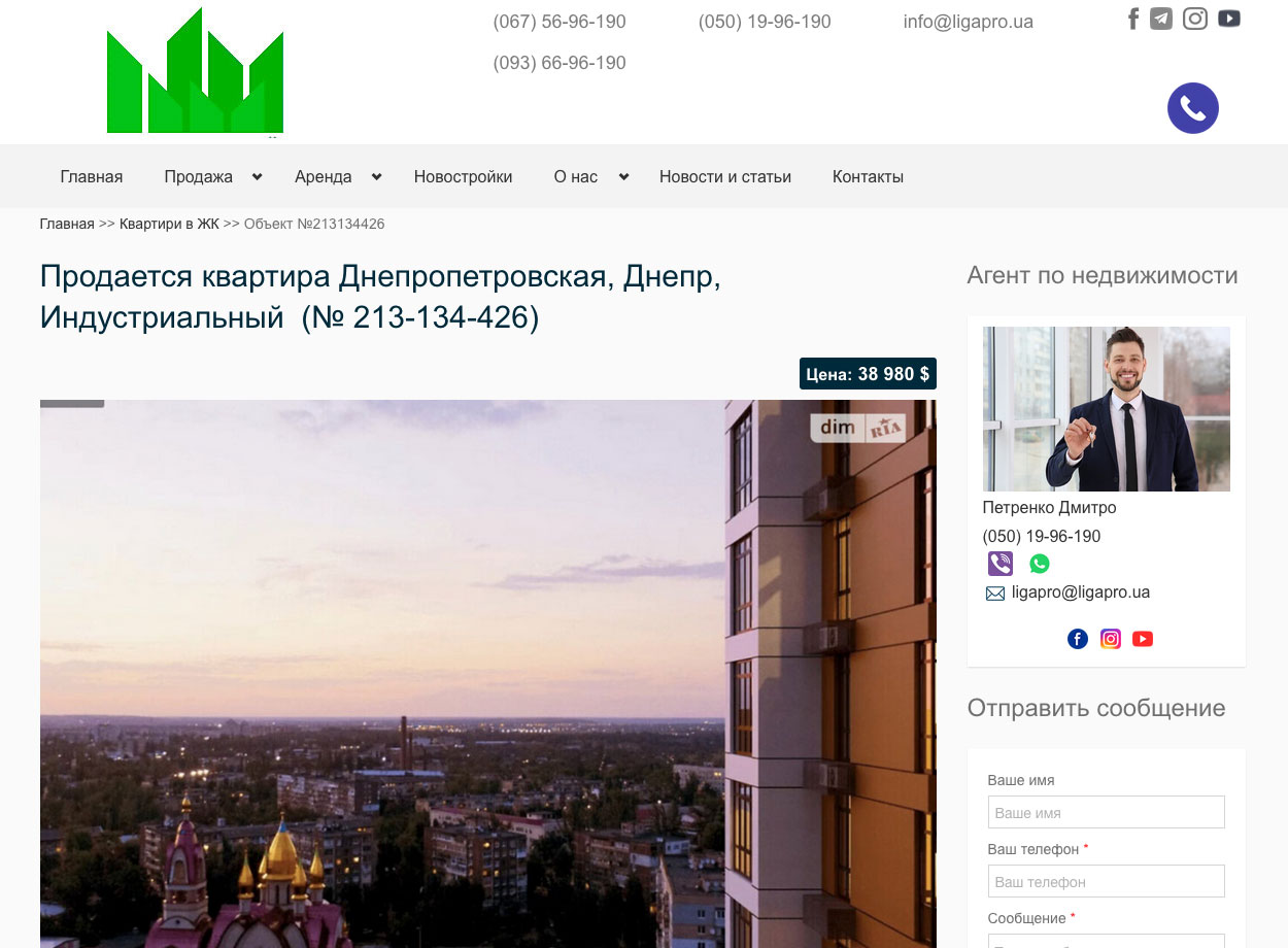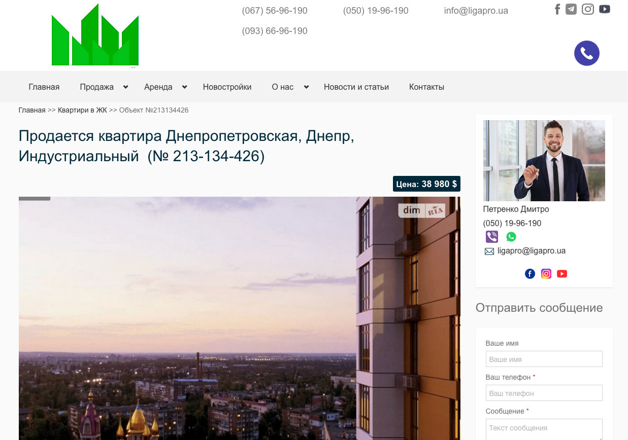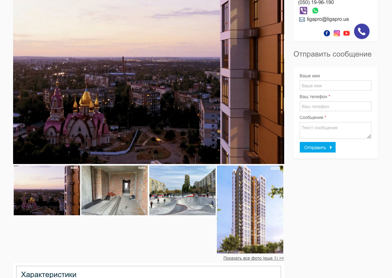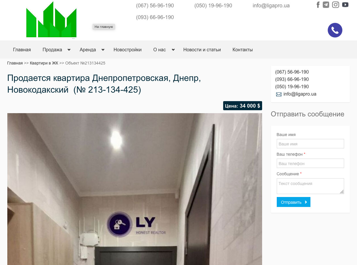 При детальном просмотре объекта, под контактами риэлтора, располагается форма отправки сообщения риэлтору (все эти заявки попадают в раздел «Заявки/Лиды» системы ЛигаПро) (Рис. 228).