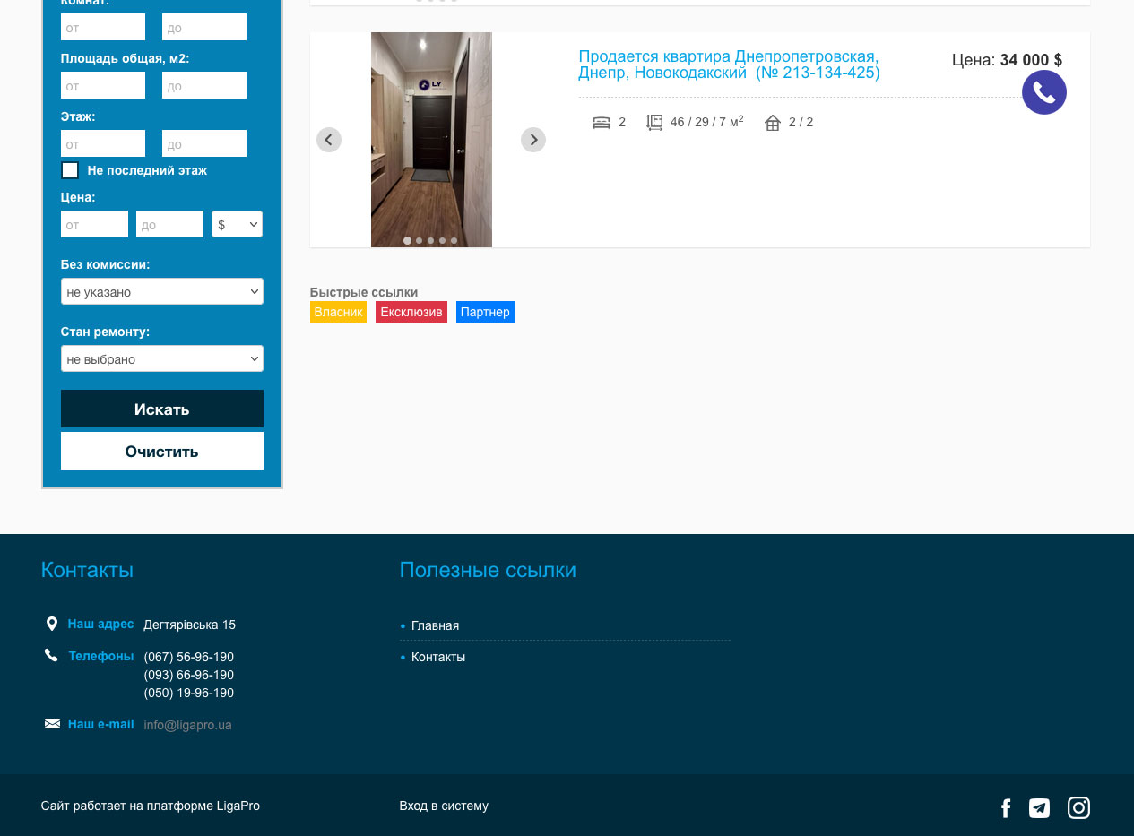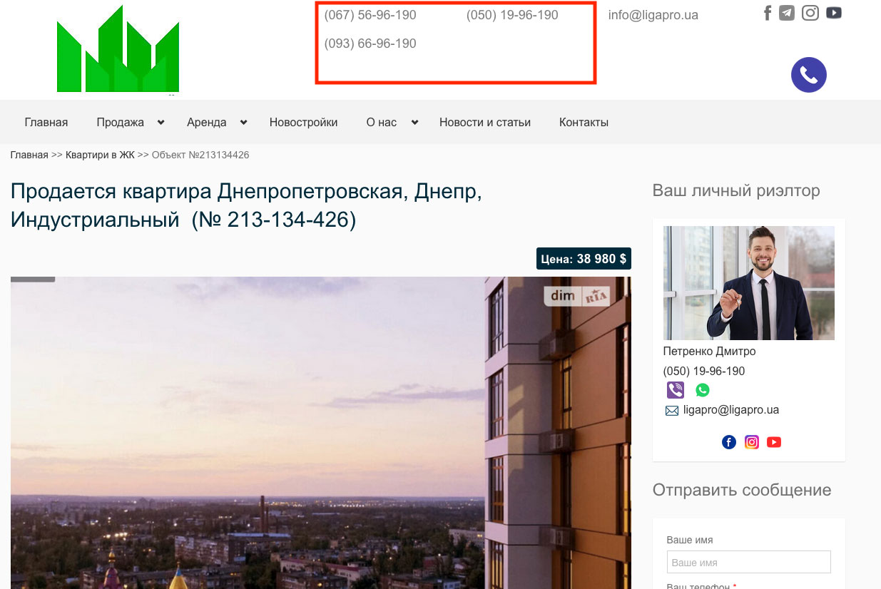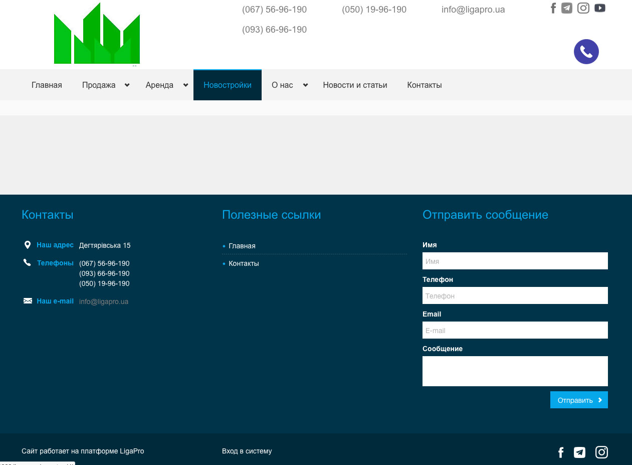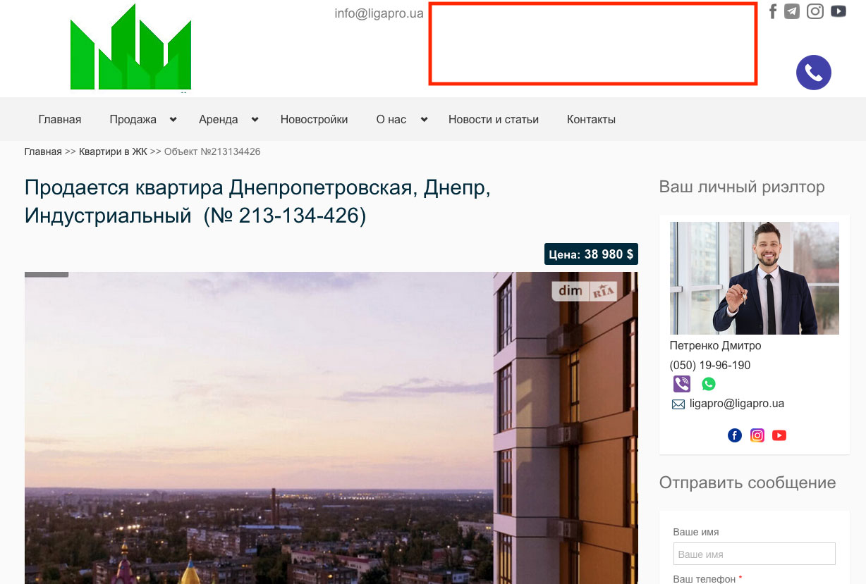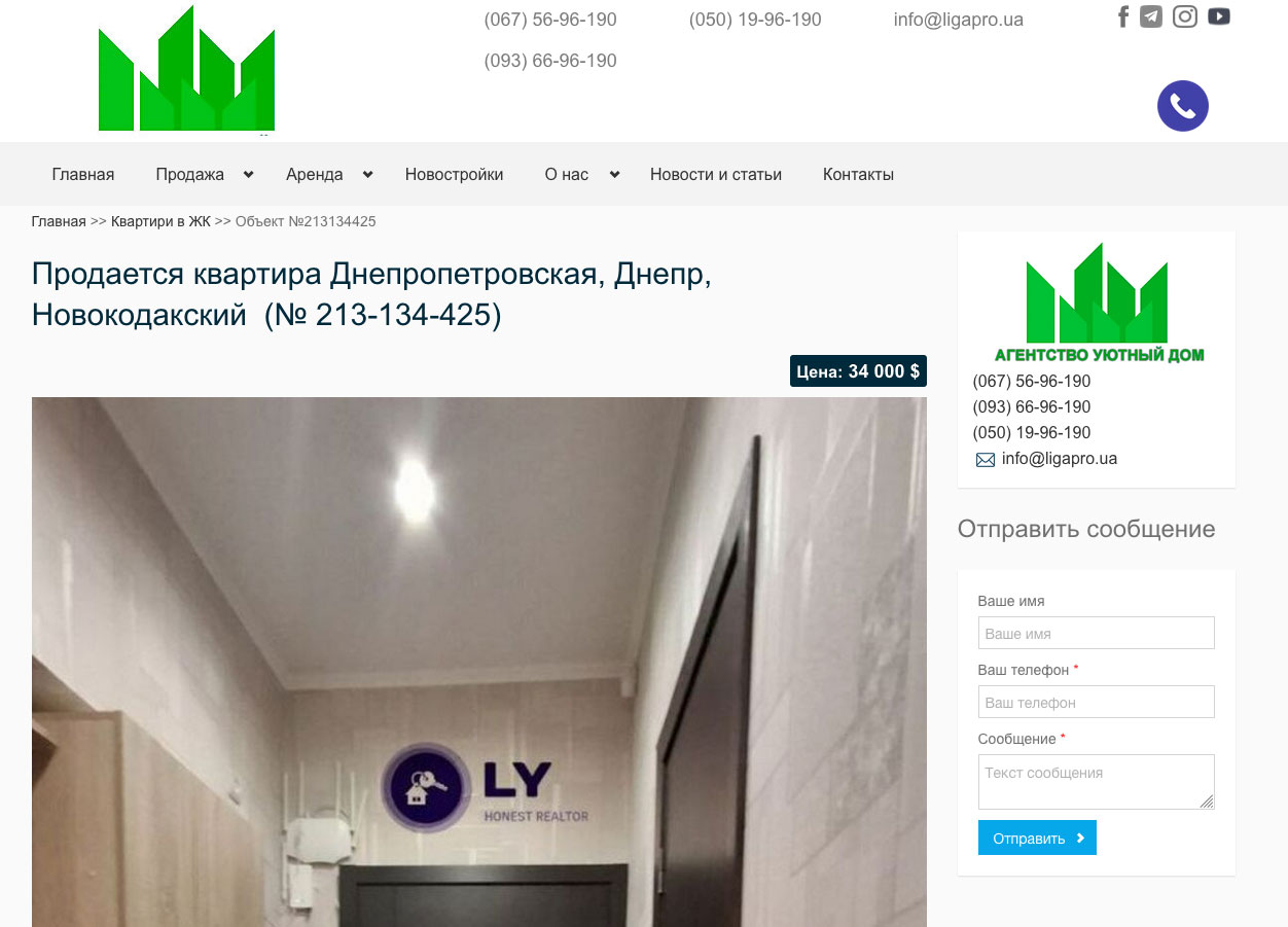 При детальном просмотре объекта, под контактами риэлтора, располагается форма отправки сообщения риэлтору (все эти заявки попадают в раздел «Заявки/Лиды» системы ЛигаПро) (Рис. 228).