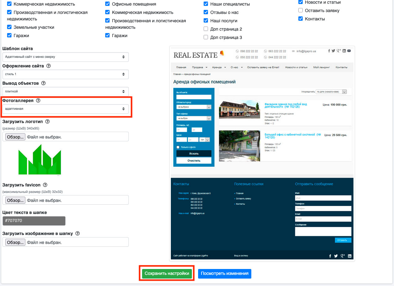 Если Вы хотите изменить её тип, найдите пункт «Фотогалерея» и выберите нужный вариант. После этого нажмите кнопку «Сохранить настройки» (Рис. 189).