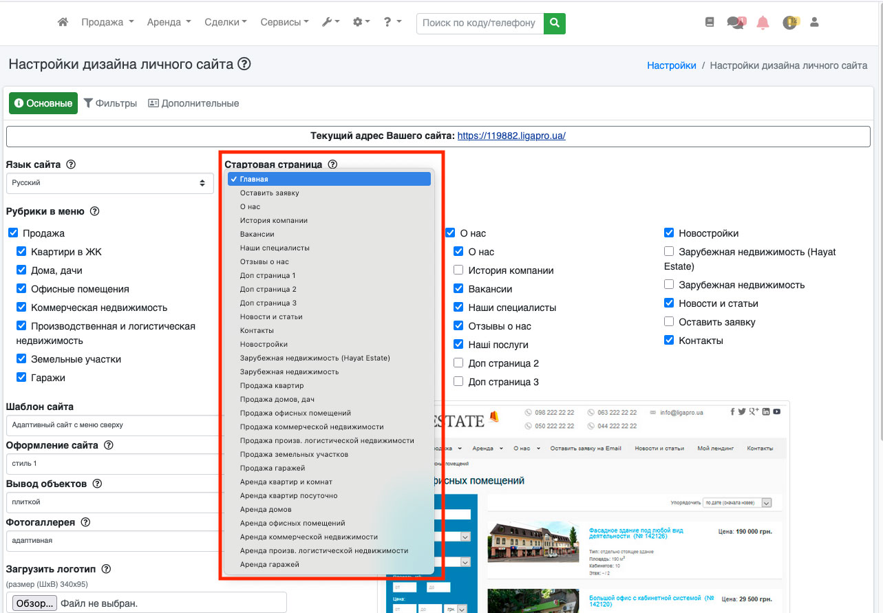 Выбрать страницу, которая будет загружаться по умолчанию при переходе на сайт, также можно в настройках дизайна сайта. По умолчанию загружается главная страница сайта, но Вы можете указать, например, страницу с каталогом объектов или страницу с информацией о Вас. Это бывает удобно для клиентов, чтобы они сразу попадали на нужную страницу. Чтобы изменить главную страницу, в пункте «Стартовая страница» выберите нужную страницу и нажмите кнопку «Сохранить» (Рис. 194).