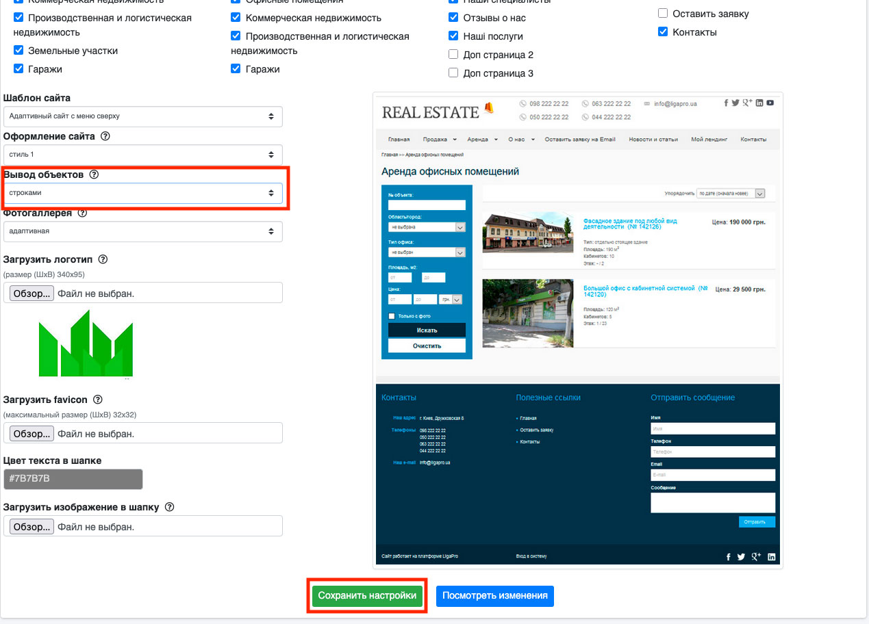 По умолчанию установлен вывод плиткой. Если Вы хотите поменять вывод на списком, найдите пункт «Вывод объектов» и выберите нужный Вам тип вывода. После этого нажмите кнопку «Сохранить настройки» (Рис. 199). Если Вы всё сделали правильно, объекты будут отображаться так, как Вы выбрали.
