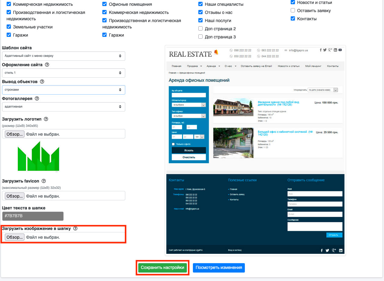Если Вы хотите добавить баннер в самый верх сайта (по умолчанию там отображаются контакты компании на белом фоне без цвета), то на странице настроек сайта на вкладке «Основные» найдите пункт «Загрузить изображение в шапку» и прикрепите свой баннер. После этого нажмите кнопку «Сохранить настройки» (Рис. 200).