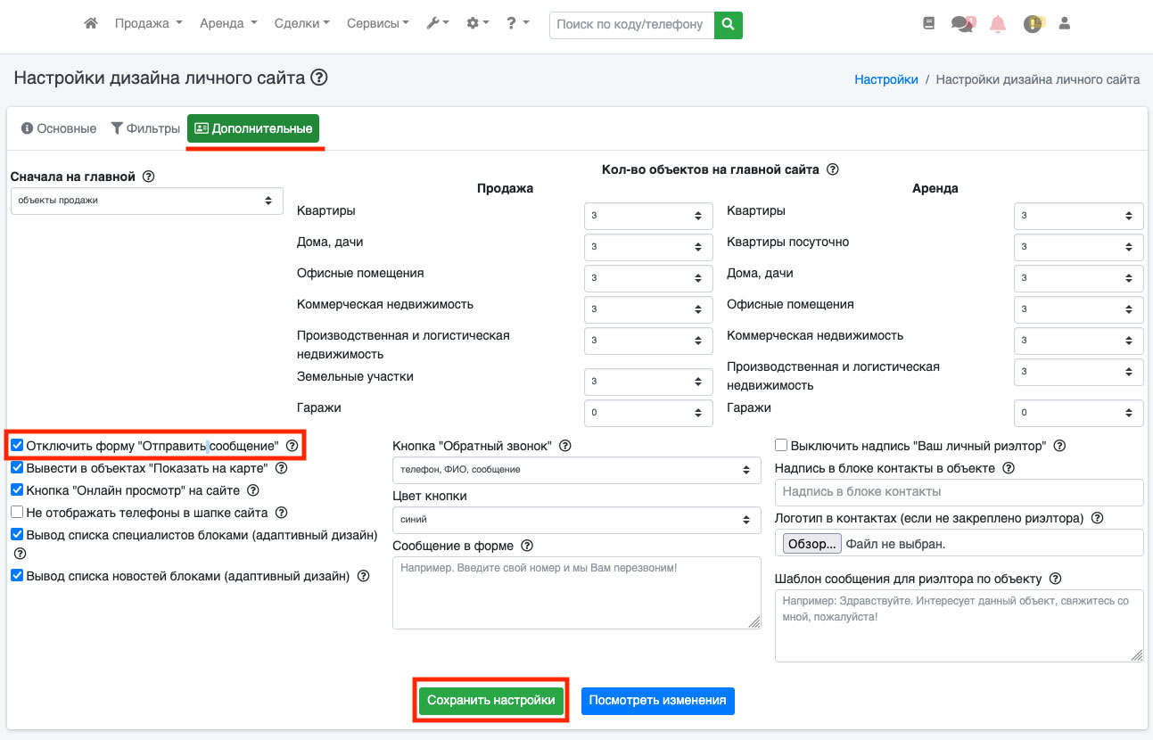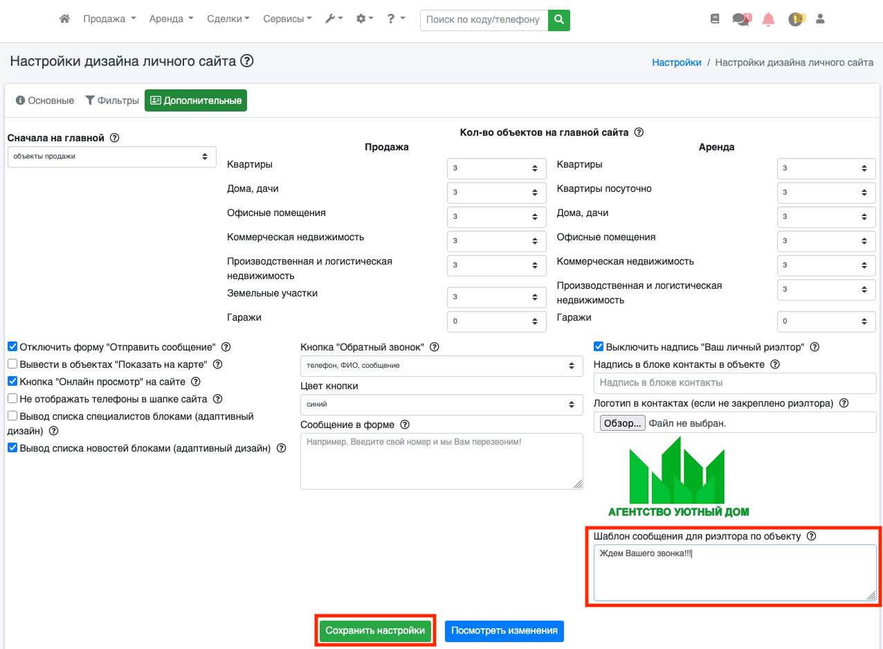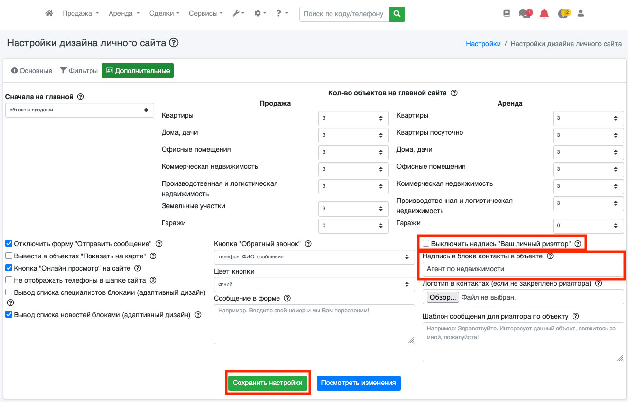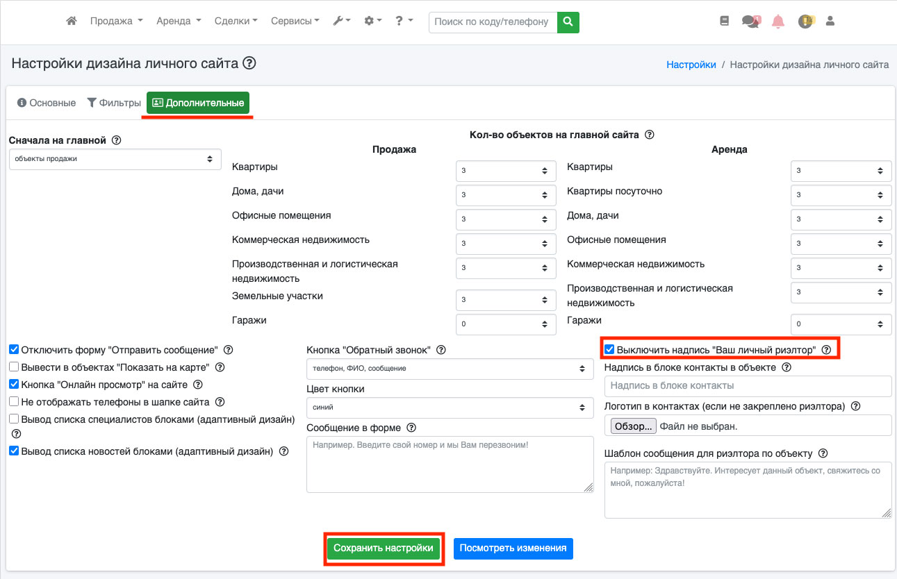 Если Вы хотите отключить эту надпись, найдите пункт «Выключить надпись 'Ваш личный риэлтор'» и поставьте там галочку. После этого нажмите кнопку «Сохранить настройки» (Рис. 220).