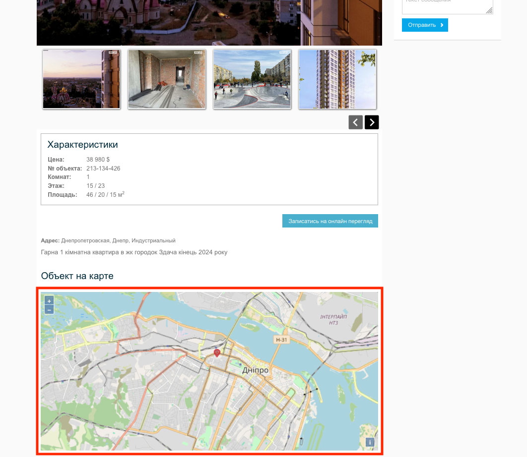 На Вашем сайте при подробном просмотре объекта под описанием отображается карта с местоположением объекта (Рис. 206).