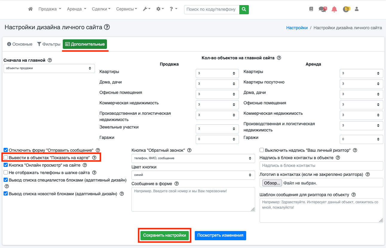 Иногда возникает необходимость отключить эту карту, например, если Вы работаете с домами и не хотите показывать их местоположение. В таких случаях карту можно отключить. Для этого зайдите на вкладку «Дополнительно», найдите пункт «Вывести в объектах 'Показать на карте'» и снимите галочку. После этого нажмите кнопку «Сохранить настройки» (Рис. 207).