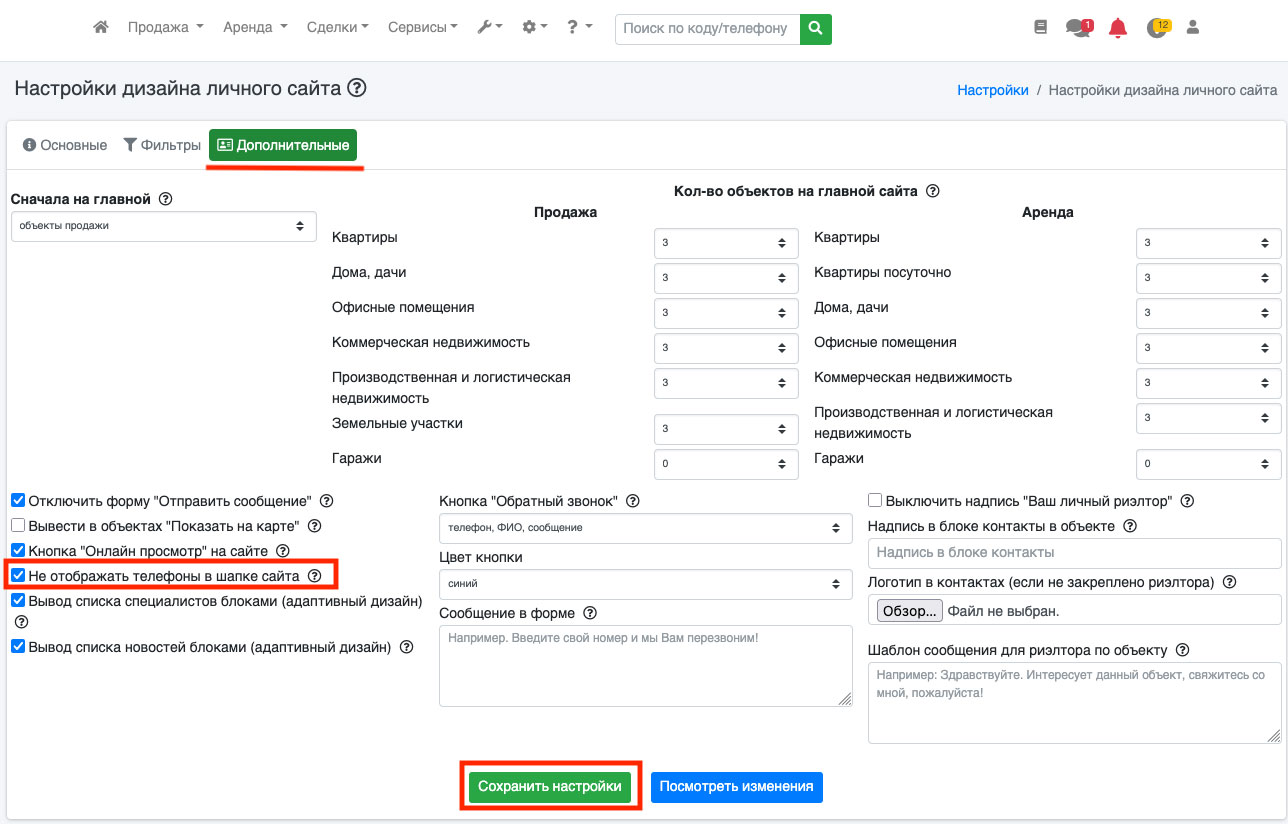 Если Вы хотите отключить отображение телефонов, перейдите на вкладку «Дополнительно», найдите пункт «Не отображать телефоны в шапке сайта» и установите там галочку. Затем нажмите кнопку «Сохранить настройки» (Рис. 210).
