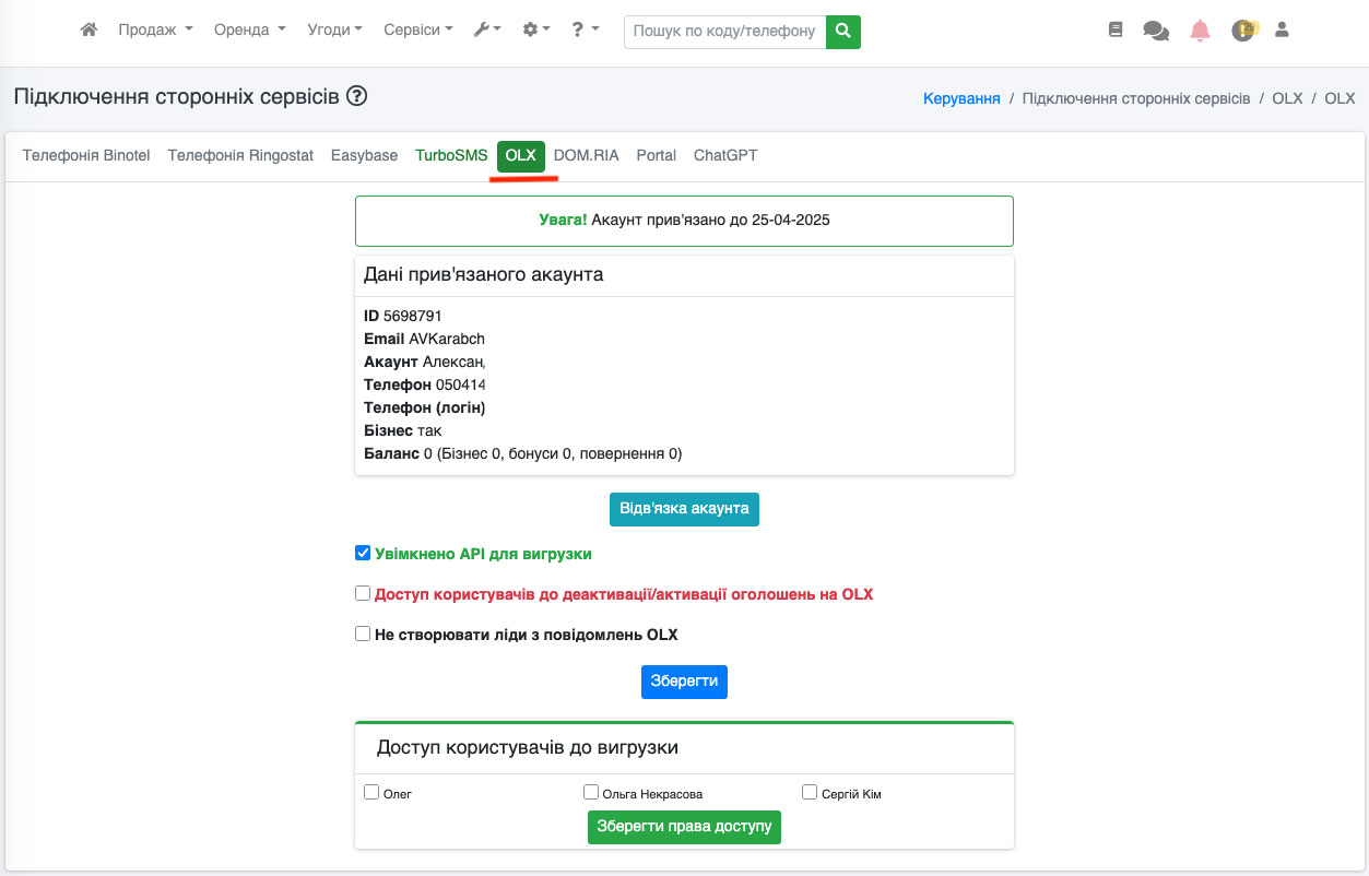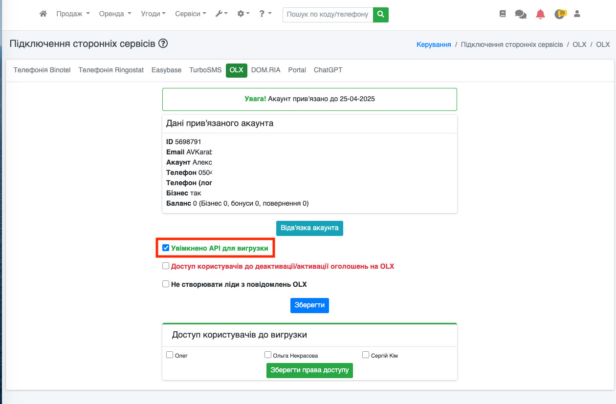 На вкладці OLX поставте галочку біля пункту «Ввімкнено API для вивантаження» та натисніть на кнопку «Зберегти» (Рис. 1625).