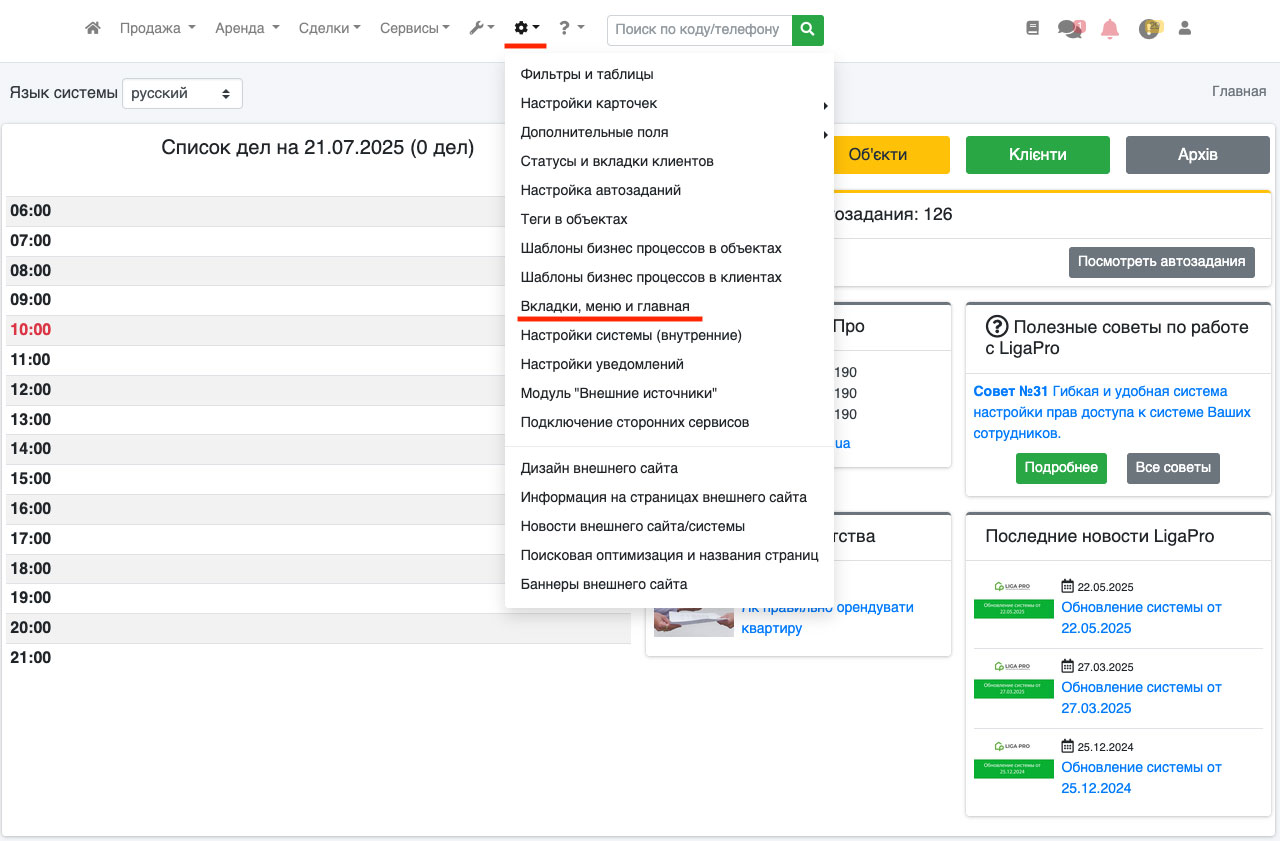 Для этого перейдите в раздел «Настройки → Настройки меню, вкладок и главной» (рис. 1695).