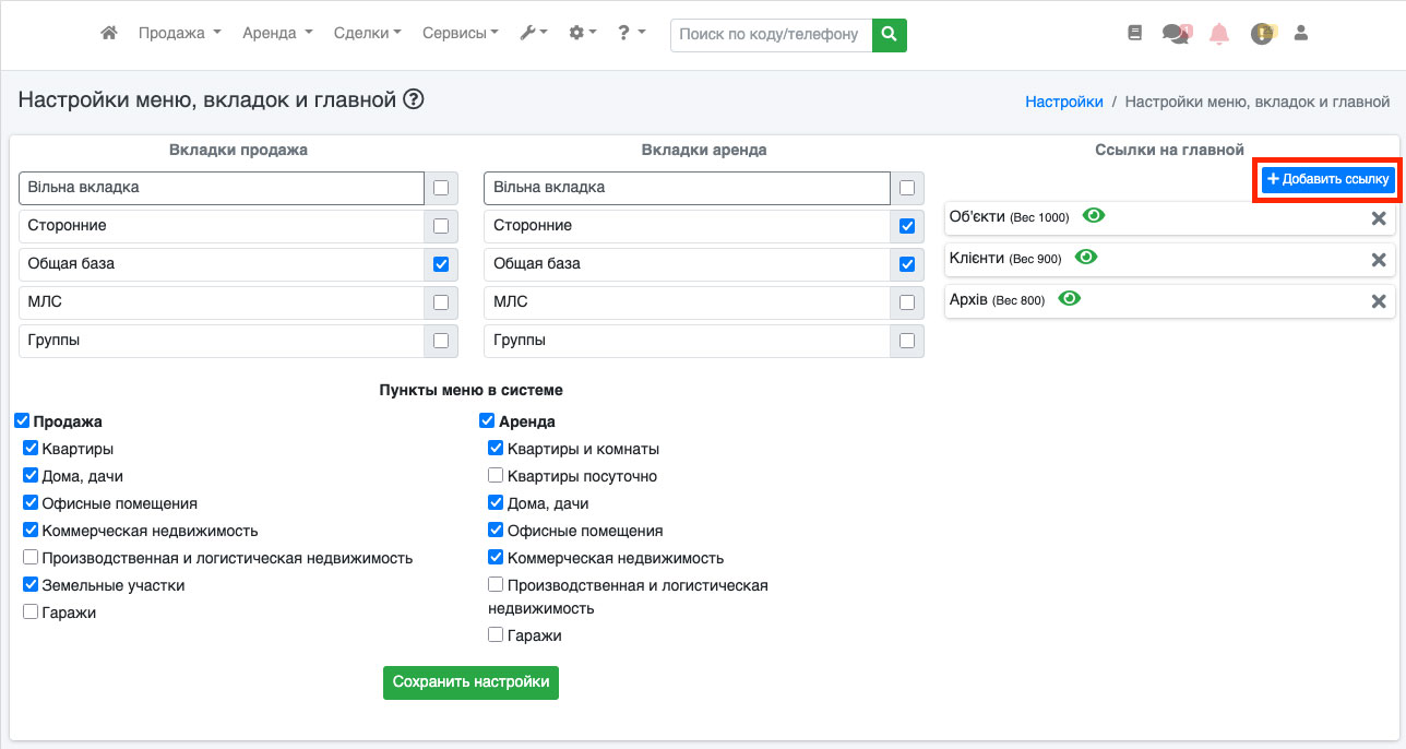 Откроются настройки главной страницы системы. Нажмите кнопку «Добавить ссылку» (рис. 1696).