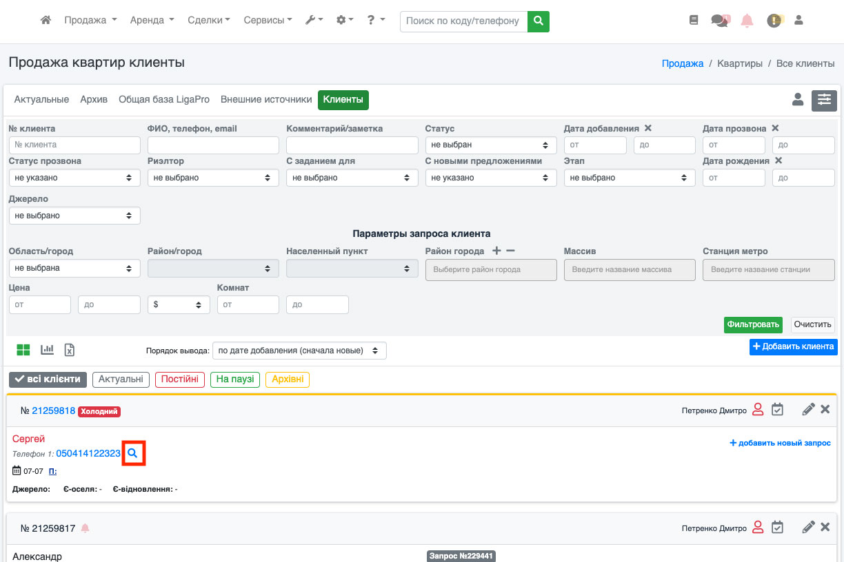 В карточке редактирования найдите контакты клиента. Возле каждого заполненного контакта также будет иконка лупы (рис. 1727). Нажав на неё, вы сможете просмотреть все объекты и клиентов с этим номером.