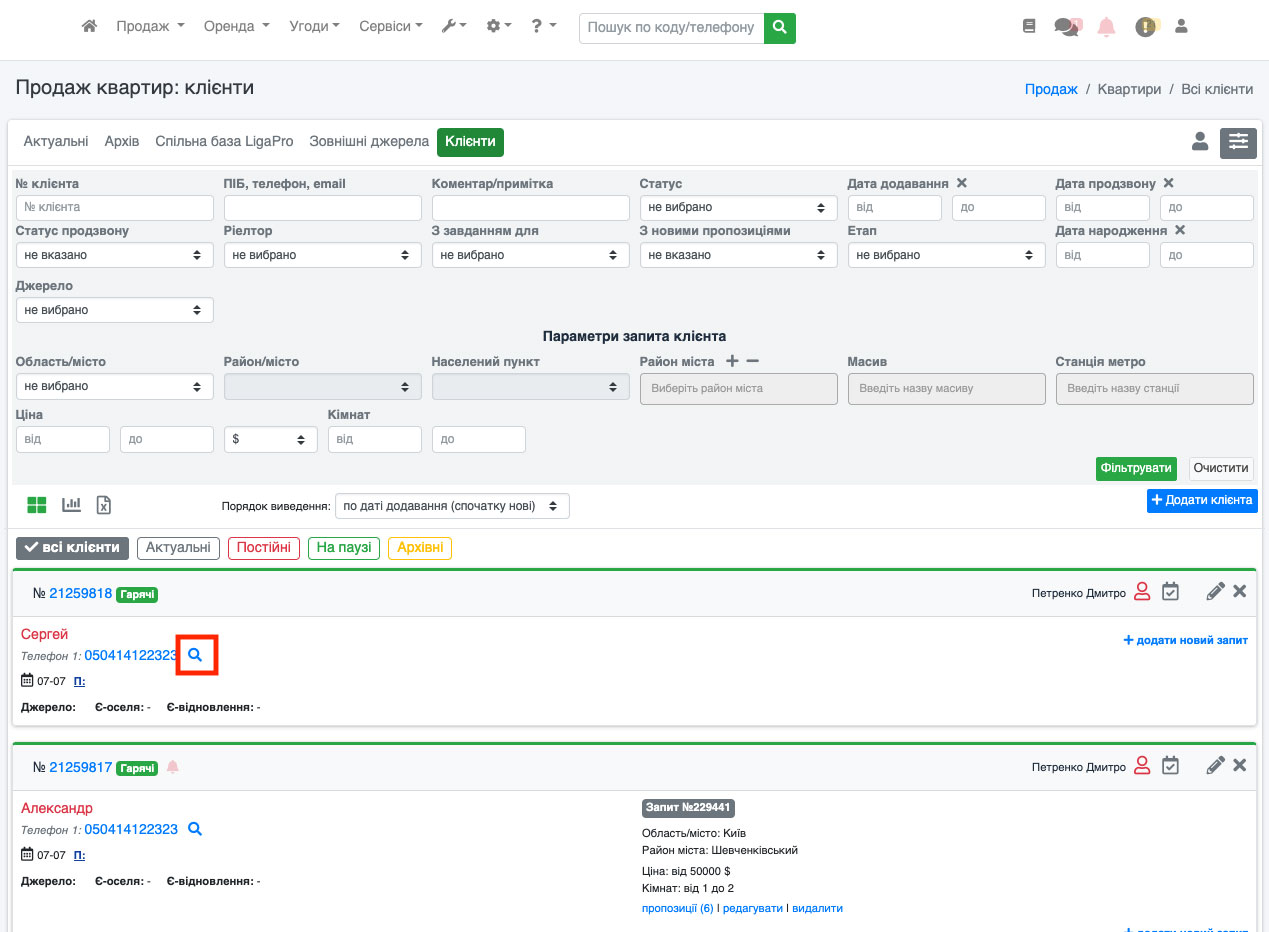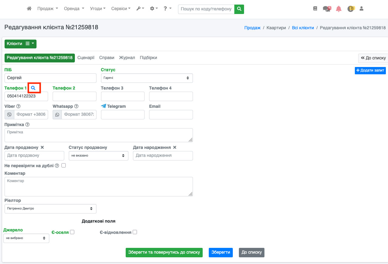 У картці редагування знайдіть контакти власника, біля кожного заповненого контакту у Вас також буде іконка лупи (Рис. 1701). Натиснувши на яку Ви зможете переглянути всі об'єкти та клієнтів з цим номером.