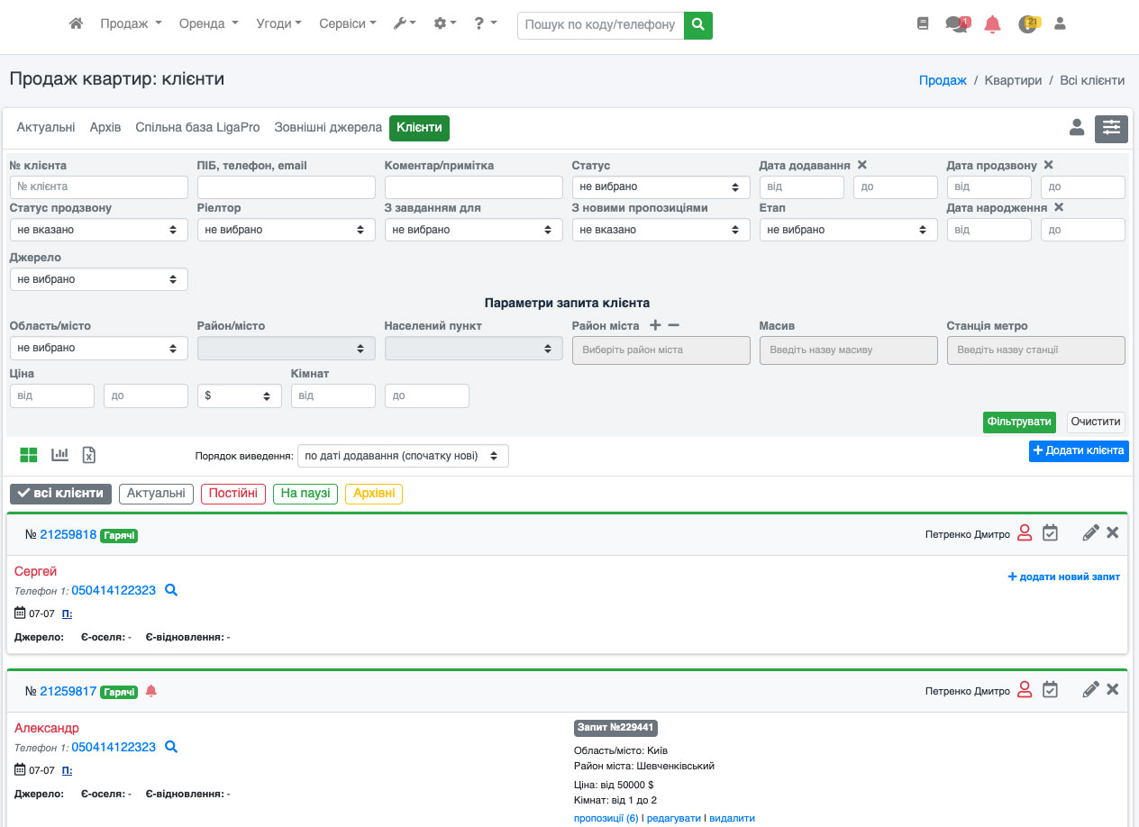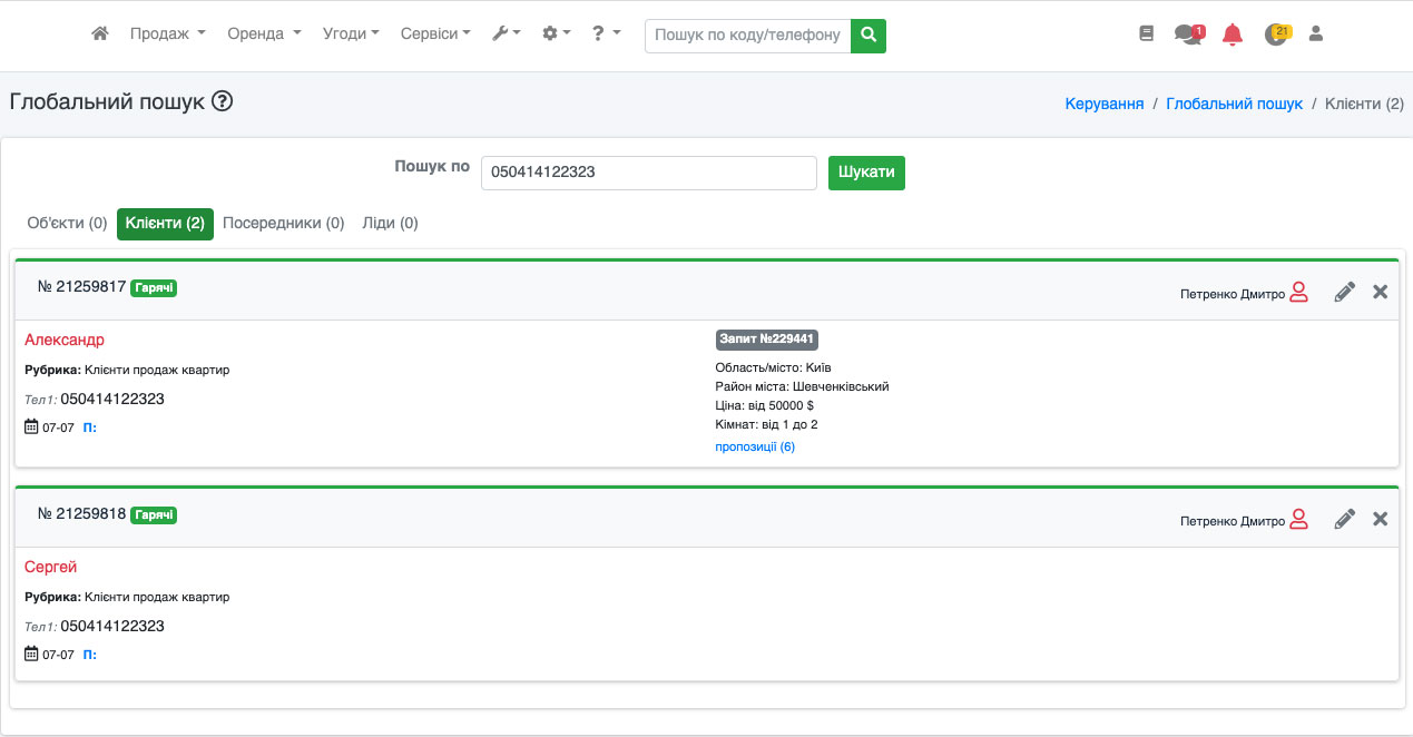 Щоб швидко перевірити базу на наявність інших клієнтів та об'єктів від одного клієнта, існує швидкий пошук за номером клієнта у базі зі списку та картки редагування.