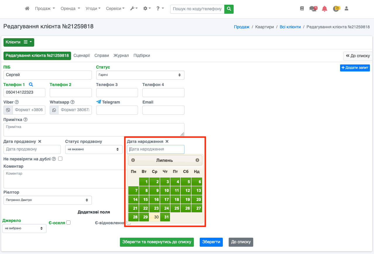 Для того щоб вказати день народження, перейдіть в картку клієнта (Рис. 1702).