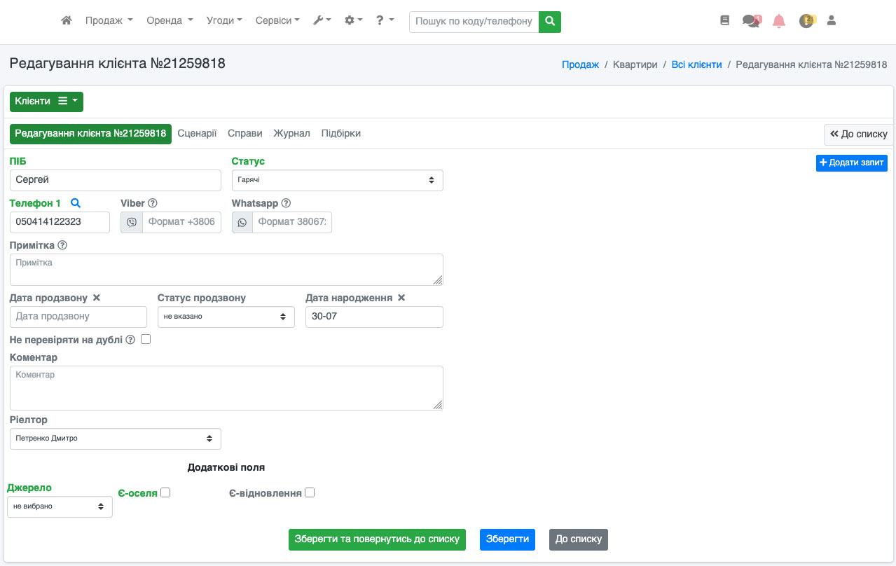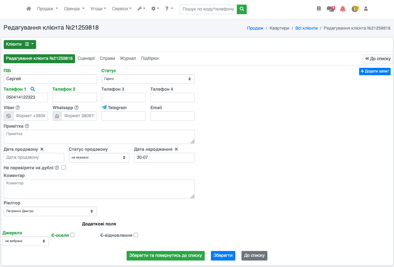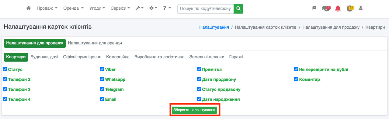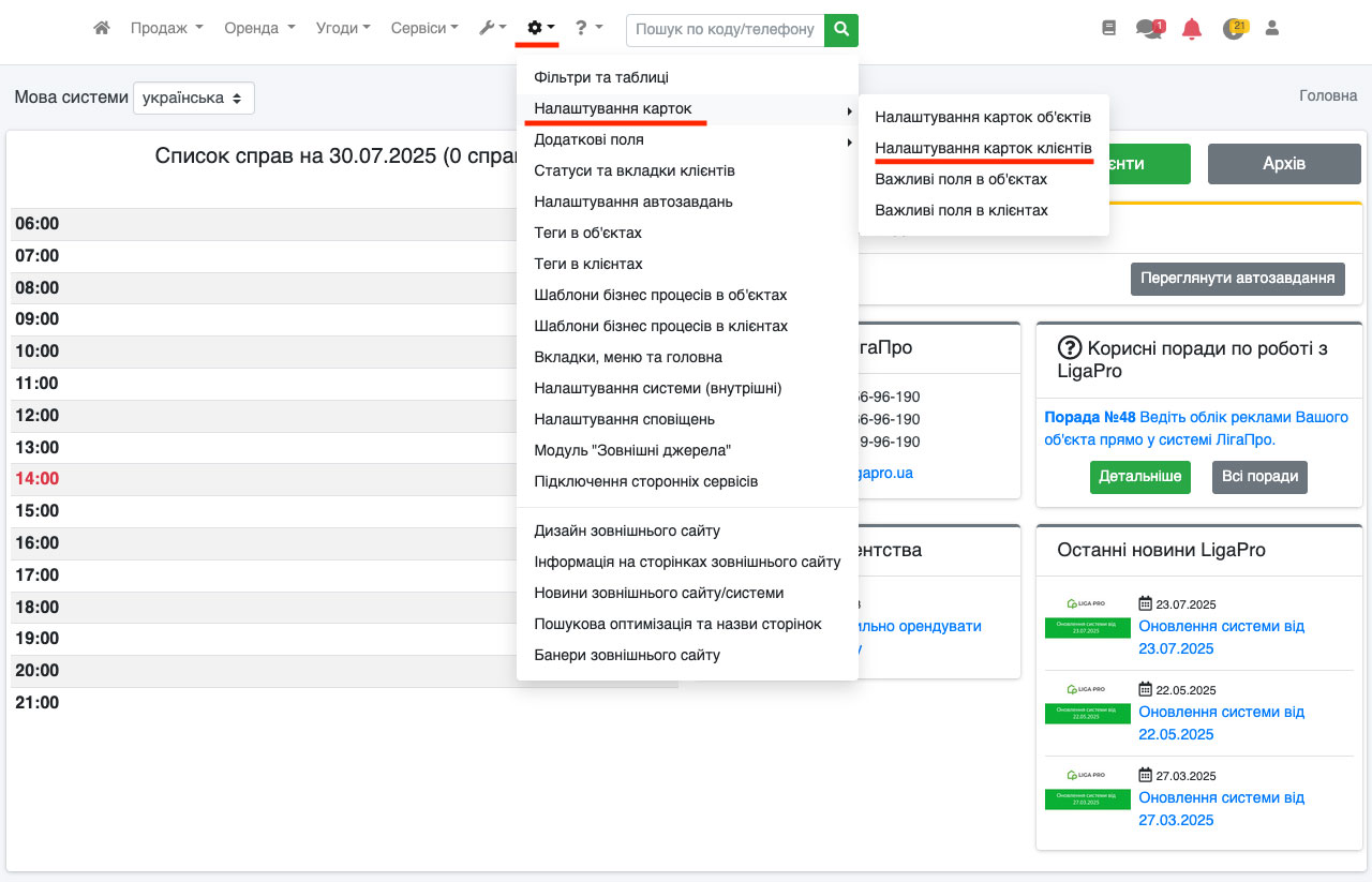 Для зручності роботи в системі ЛігаПро Ви маєте можливість персоналізувати картки клієнтів. Ви можете залишити тільки ті поля, які Вам необхідні та відключити всі інші. Це дозволить спростити картку клієнта, агентам буде простіше орієнтувати і швидше додавати клієнтів. Щоб вимкнути зайві поля, перейдіть до пункту «Налаштування-Настроювання карток – Налаштування карток клієнтів» (Рис. 1712).