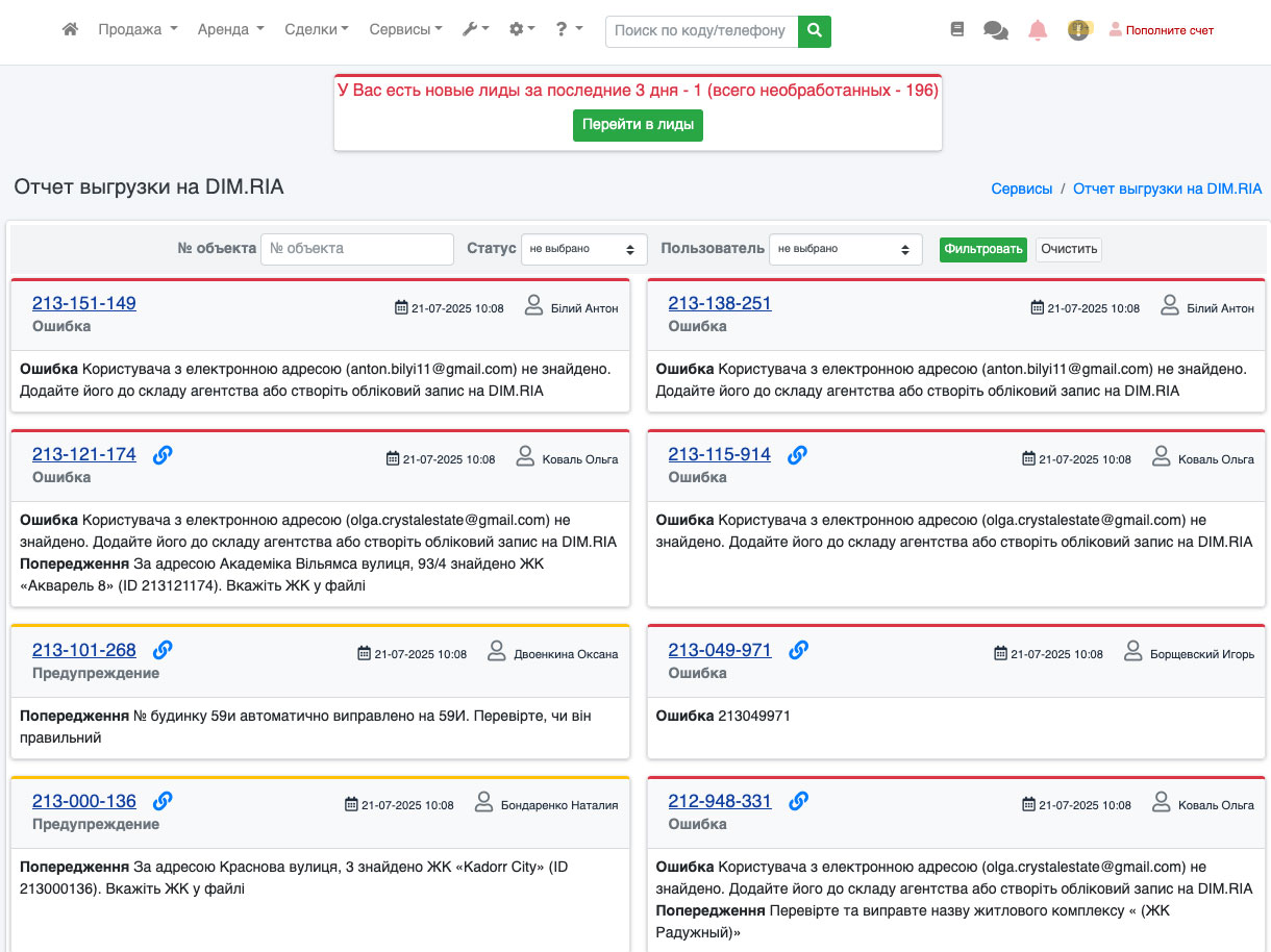 У Вас відкриється список об'єктів, надісланих клієнту (Рис. 1720). Ви бачитимете дату і час відправки, характеристики об'єкта, за ким закріплені ці об'єкти і буде можливість за кодом об'єкта перейти до його детального перегляду.