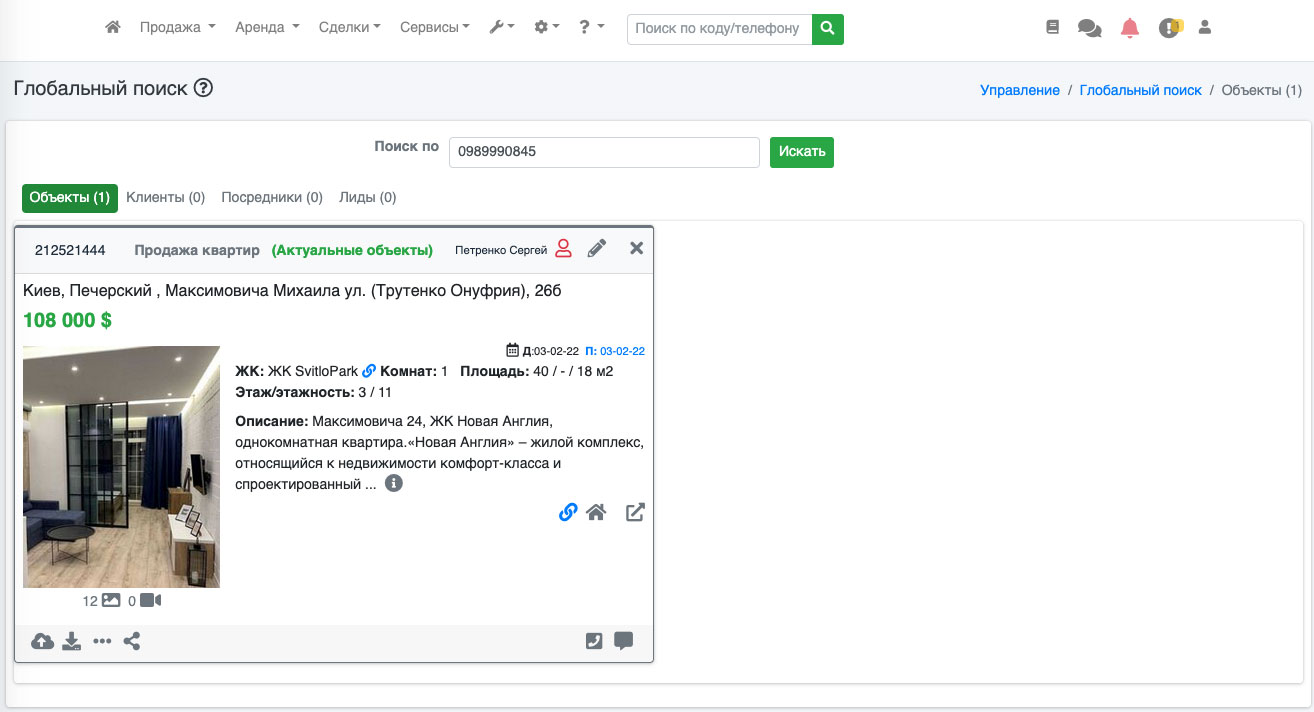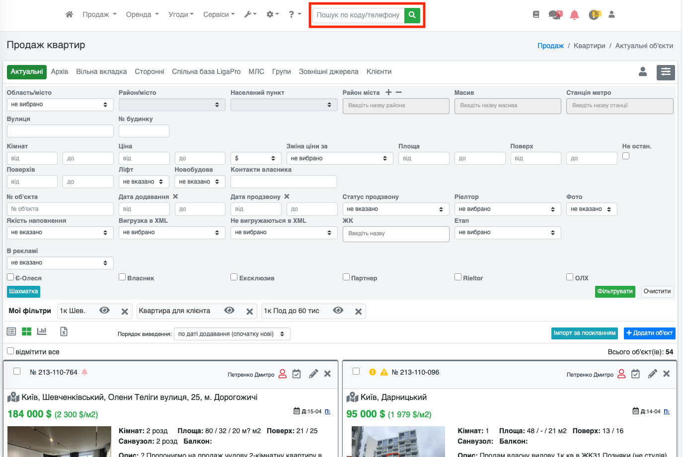 Форма поиска расположена сразу после пунктов меню в верхней части окна (Рис. 232). Поиск осуществляется либо по ID объекта или клиента, либо по номеру телефона (можно вводить не полный номер, а несколько цифр).