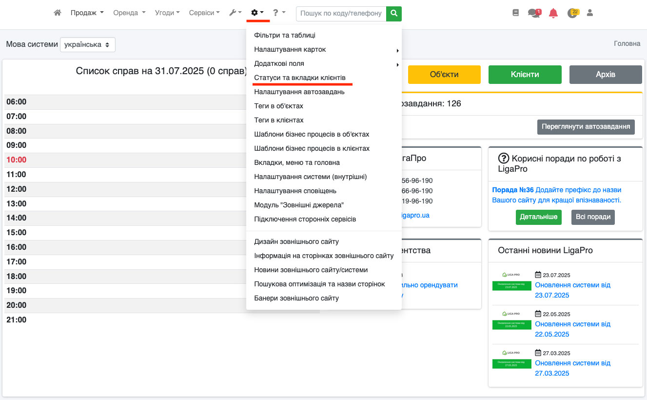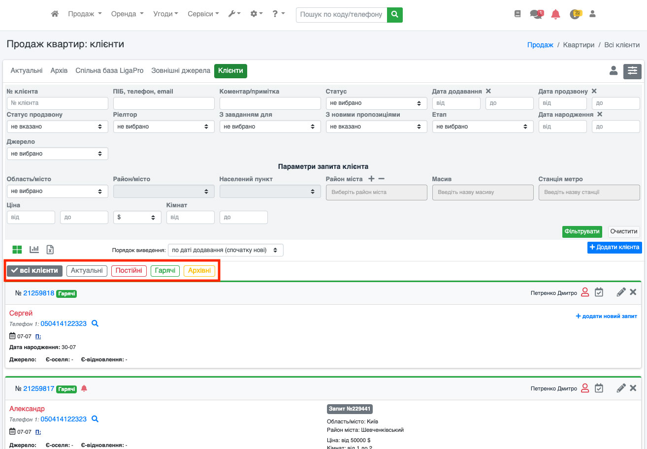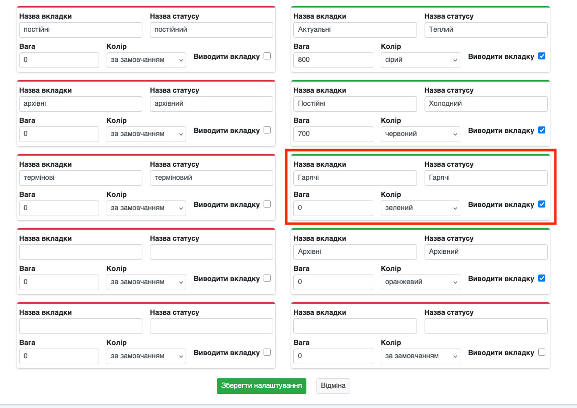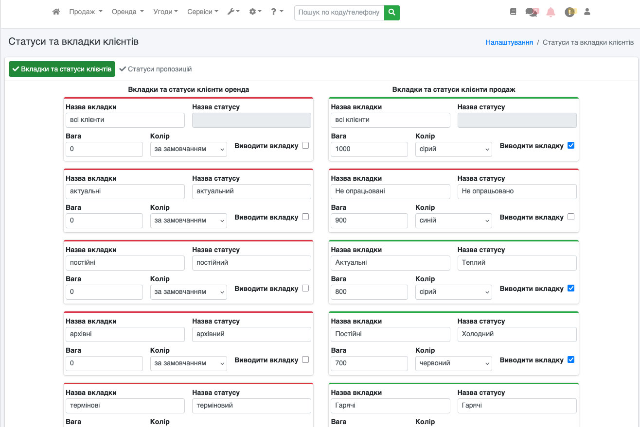 Для зручності роботи можна налаштувати окремі вкладки клієнтів. Щоб настроїти вкладки клієнтів, перейдіть до пункту «Налаштування- статуси та вкладки клієнтів» (Рис. 1779). Наприклад, можна створити такі вкладки: всі клієнти, гарячі, холодні, архів. Система вкладок дозволяє зручніше працювати з клієнтами та швидко їх фільтрувати.