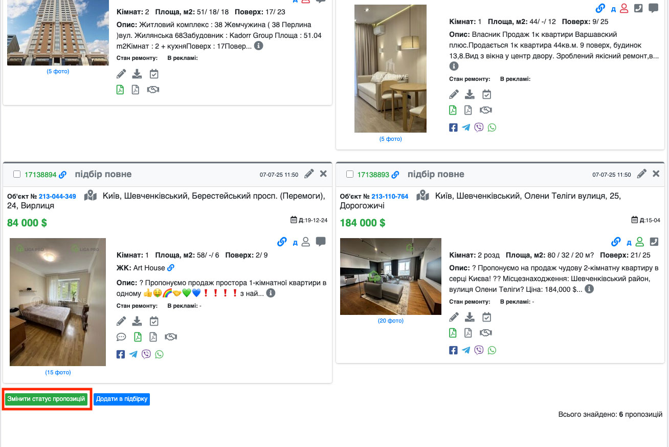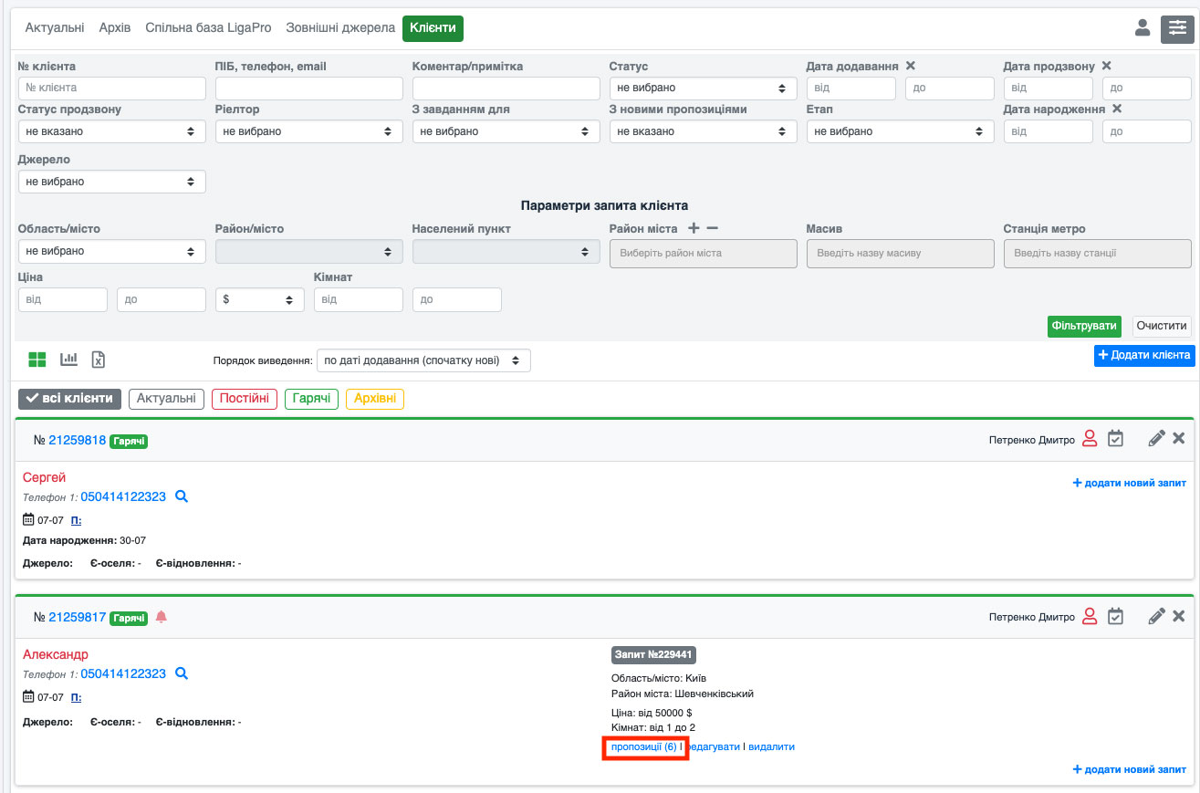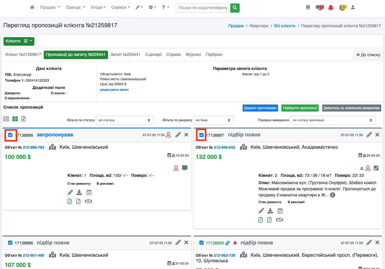 Для зручності роботи з підібраними під запит клієнтами існує можливість масового управління такими об'єктами. Ви можете масово додати об'єкти добірки або змінити статус пропозиції та додати коментар. Перейдіть до списку клієнтів, знайдіть потрібного Вам клієнта та у його запиті перейдіть до списку його пропозицій. (Рис. 1783).