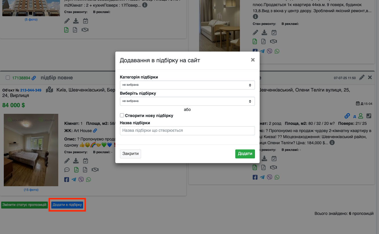 Якщо Ви хочете додати об'єкти до підбірки натисніть кнопку додати до підбірки у Вас висвітиться форма додавання об'єктів до підбірки (Рис. 1787). Виберіть існуючу підбірку або створіть нову.