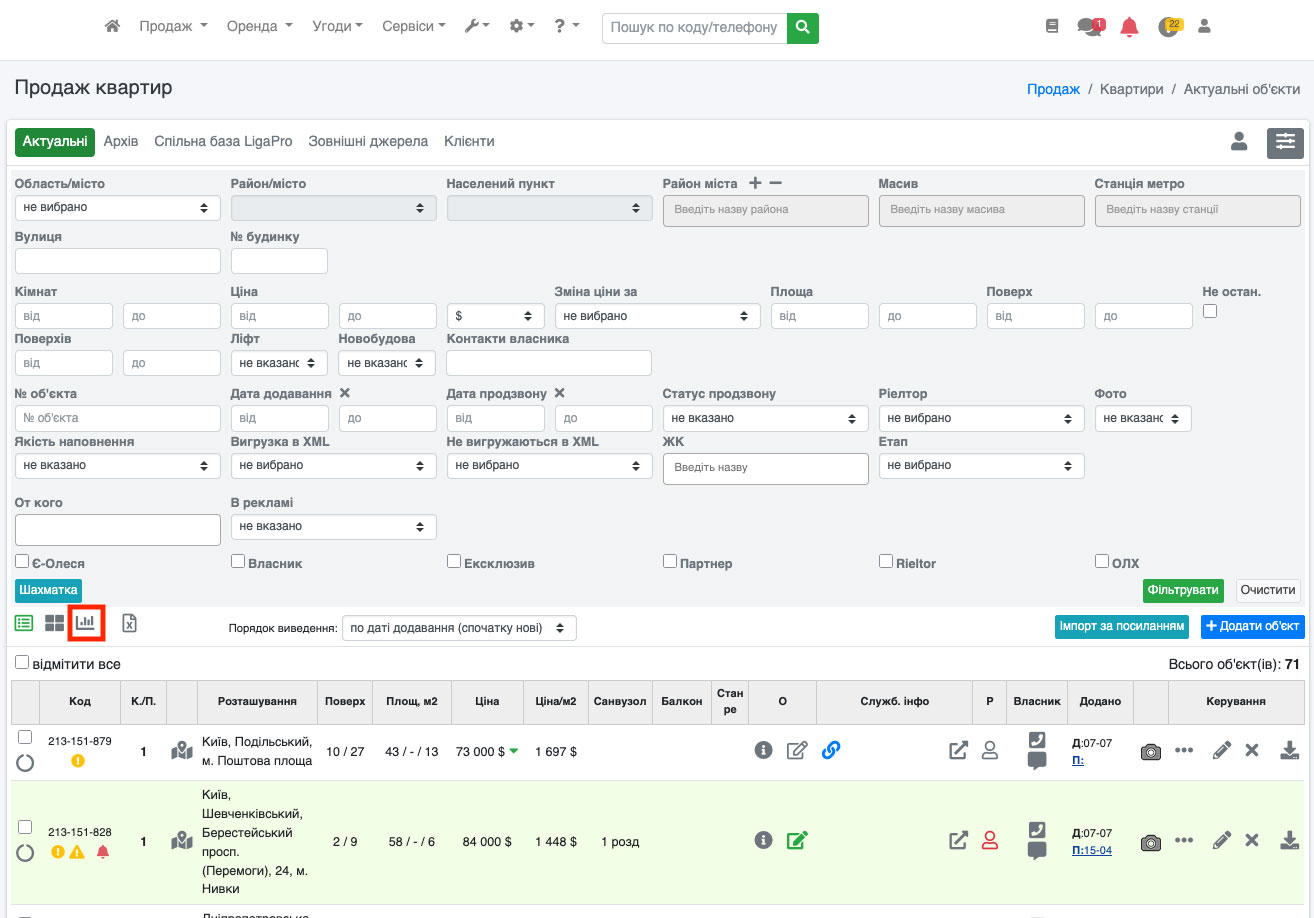 Наскрізна аналітика прив'язана до фільтра і Ви можете робити будь-яку вибірку об'єктів. Наприклад Ви хочете подивитися об'єкти в розрізі кількості кімнат, ціни, районів, житлових комплексів або в якийсь період часу, наприклад, скільки однокімнатних було додано за останній місяць у розрізі кожного співробітника. Все це дуже просто, вкажіть потрібні параметри в запиті, натисніть фільтрувати і перейдіть в режим наскрізної аналітики (Рис. 1798).