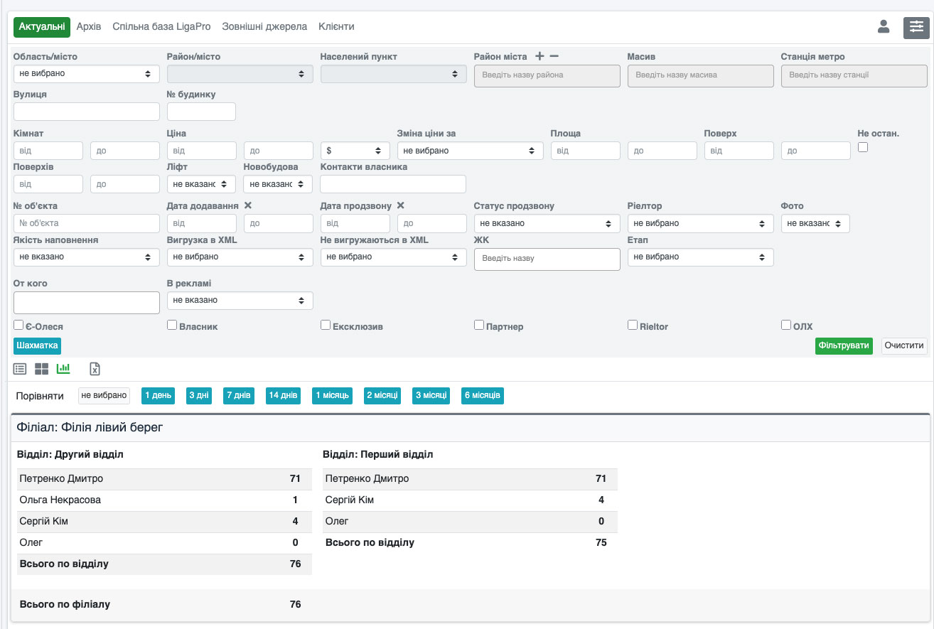 Додатково за допомогою цього сервісу Ви можете проводити порівняльний аналіз динаміки. Доступні наступні діапазони для порівняння: 1 день, 3 дні, 7 днів, 14 днів, місяць, 2 місяці, 3 місяці, 6 місяців. Наприклад Ви можете переглянути як додавали агенти об'єкти або як додавала ту чи іншу філію об'єкти цього місяця в порівнянні з минулим. Така динаміка дозволяє брати будь-які зрізи об'єктів і працювати з ними, дозволяє знаходити тонкі місця в роботі агентів і вчасно на них реагувати. Також усі ці дані Ви можете копіювати та брати для свого аналізу за своїми критеріями. Дана система дозволяє провести глибокий аналіз Вашої бази об'єктів та Ваших агентів.