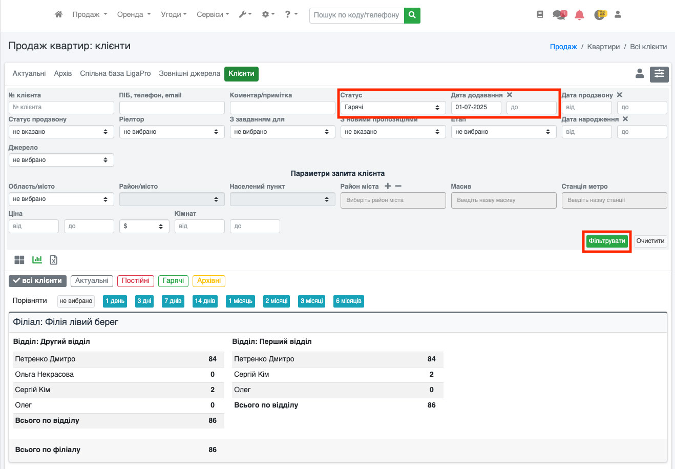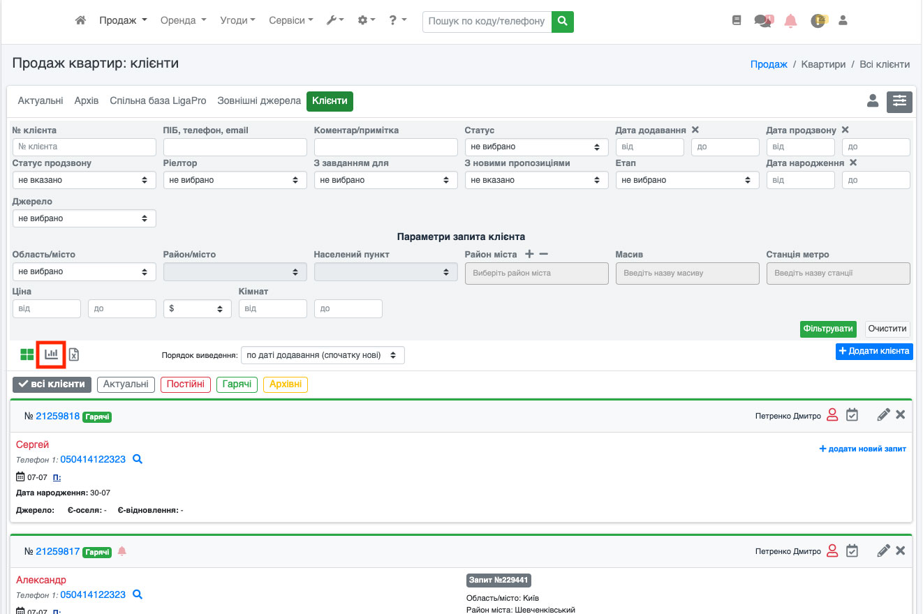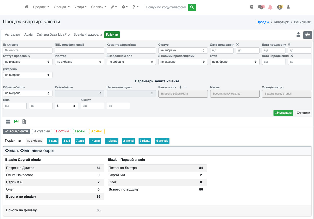 Наскрізна аналітика прив'язана до фільтра і Ви можете робити будь-яку вибірку клієнтів. Наприклад, Ви хочете подивитися клієнтів різних статусів, дати додавання додані за останній місяць у розрізі кожного співробітника. Все це дуже просто, вкажіть потрібні параметри в запиті, натисніть фільтрувати і перейдіть в режим наскрізної аналітики (Рис. 1801).