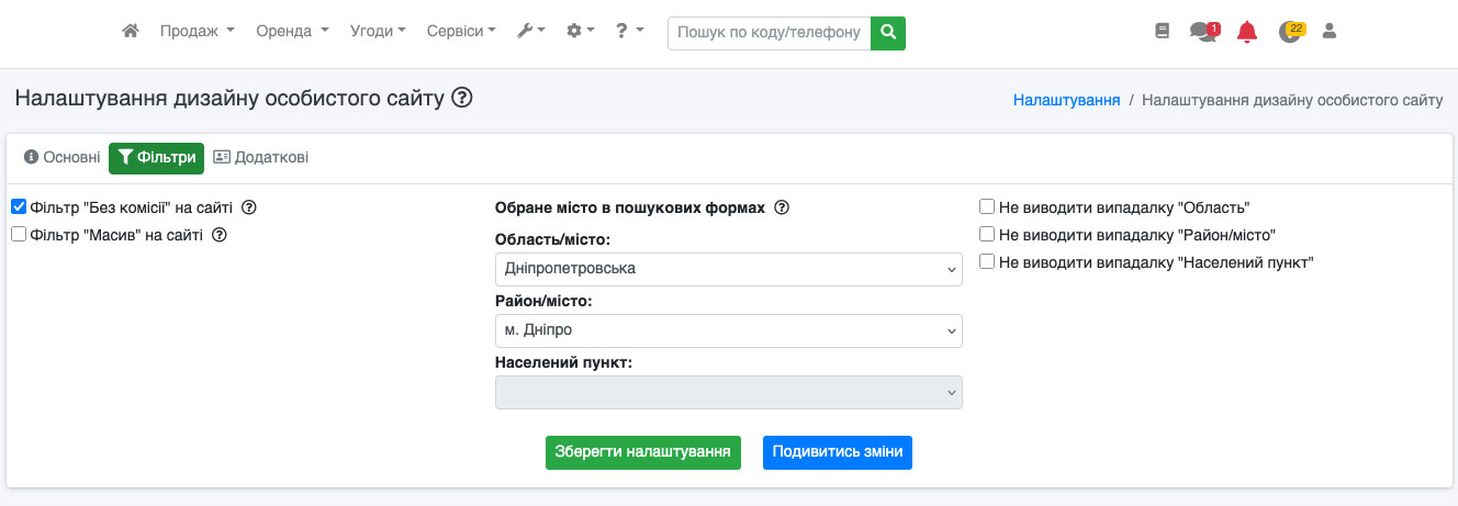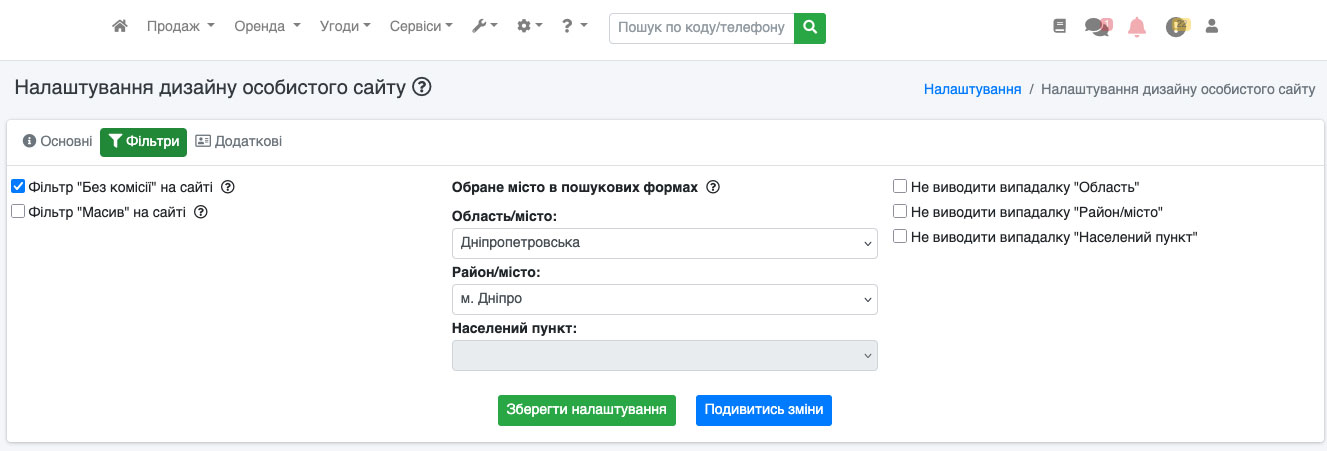 азадати у фільтрі обране місто – якщо Ви працюєте в якомусь одному місті, то Ви одразу можете встановити його у фільтрах на сайті. Тоді вашому клієнту потрібно буде одразу обирати район і не потрібно буде вказувати область, місто, а вже потім район;