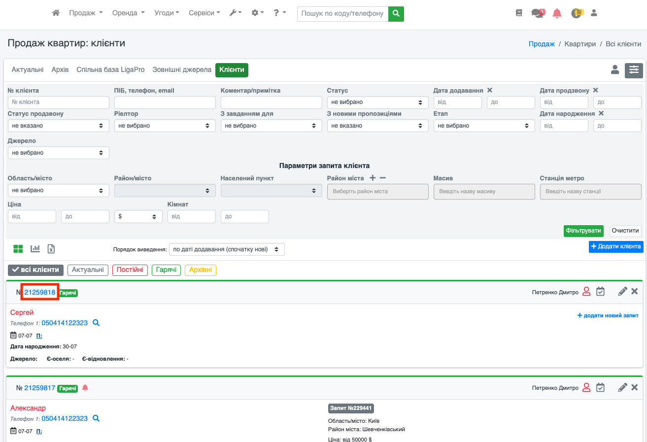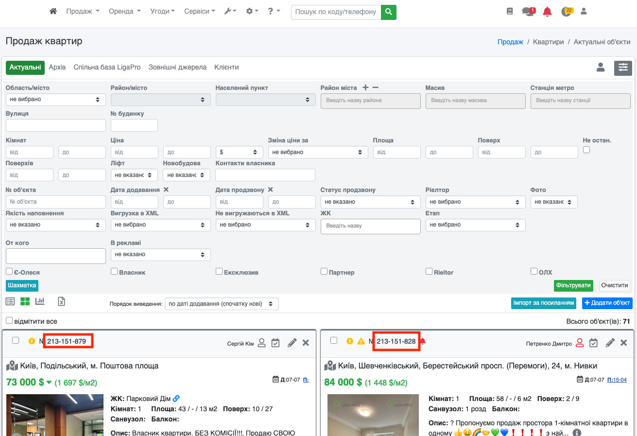 Для ідентифікації об'єктів, клієнтів, угод, заявок тощо в системі ЛігаПро використовується такий параметр як ID або код об'єкта. За цим кодом Ви можете швидко знайти потрібний вам об'єкт чи клієнта чи заявку тощо.