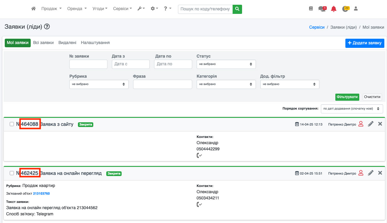 Код (ID) заявки можна переглядати і в списку, і в редагуванні, і в журналі дій (Рис. 1816).