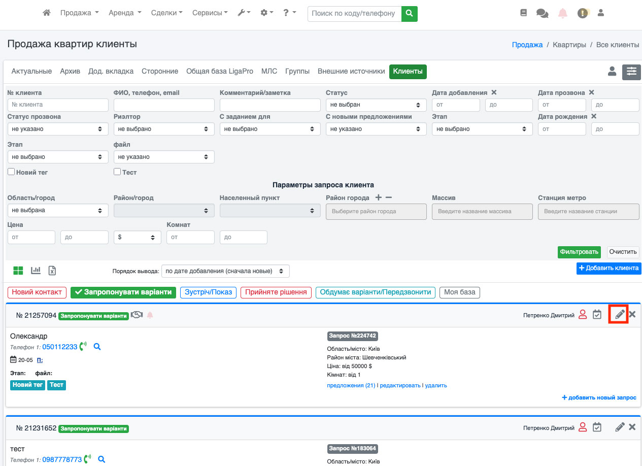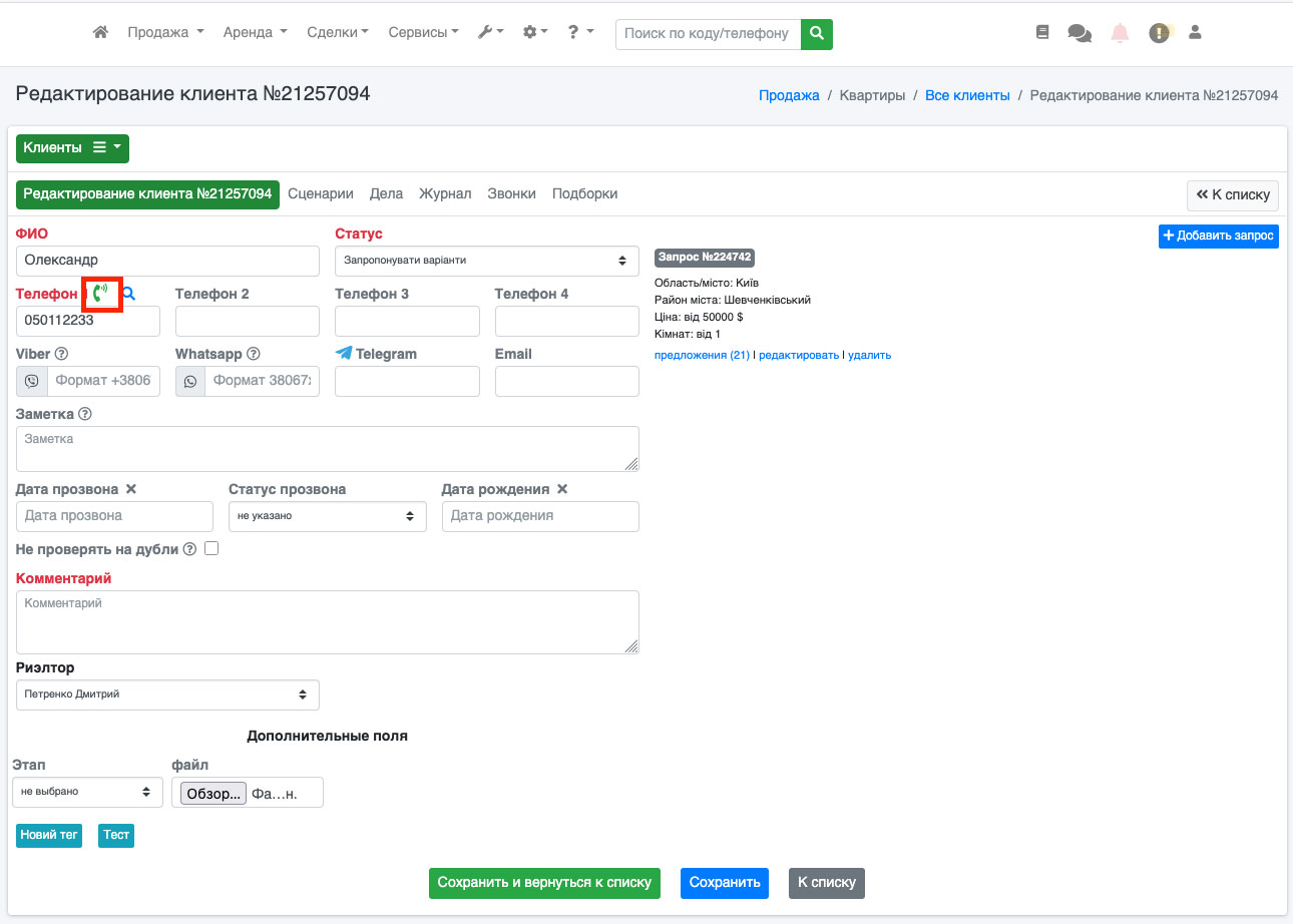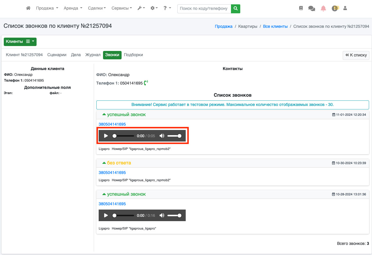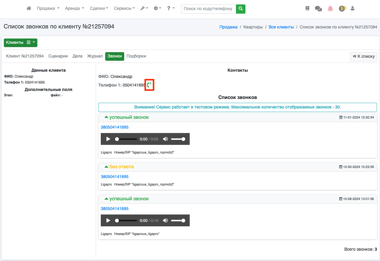 Дзвінки із CRM LigaPro зі сторінки редагування клієнта
