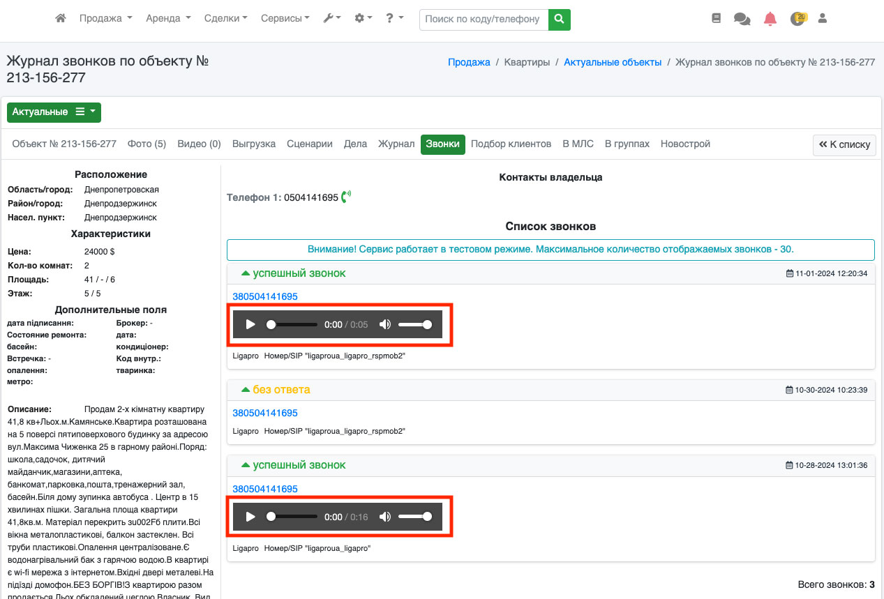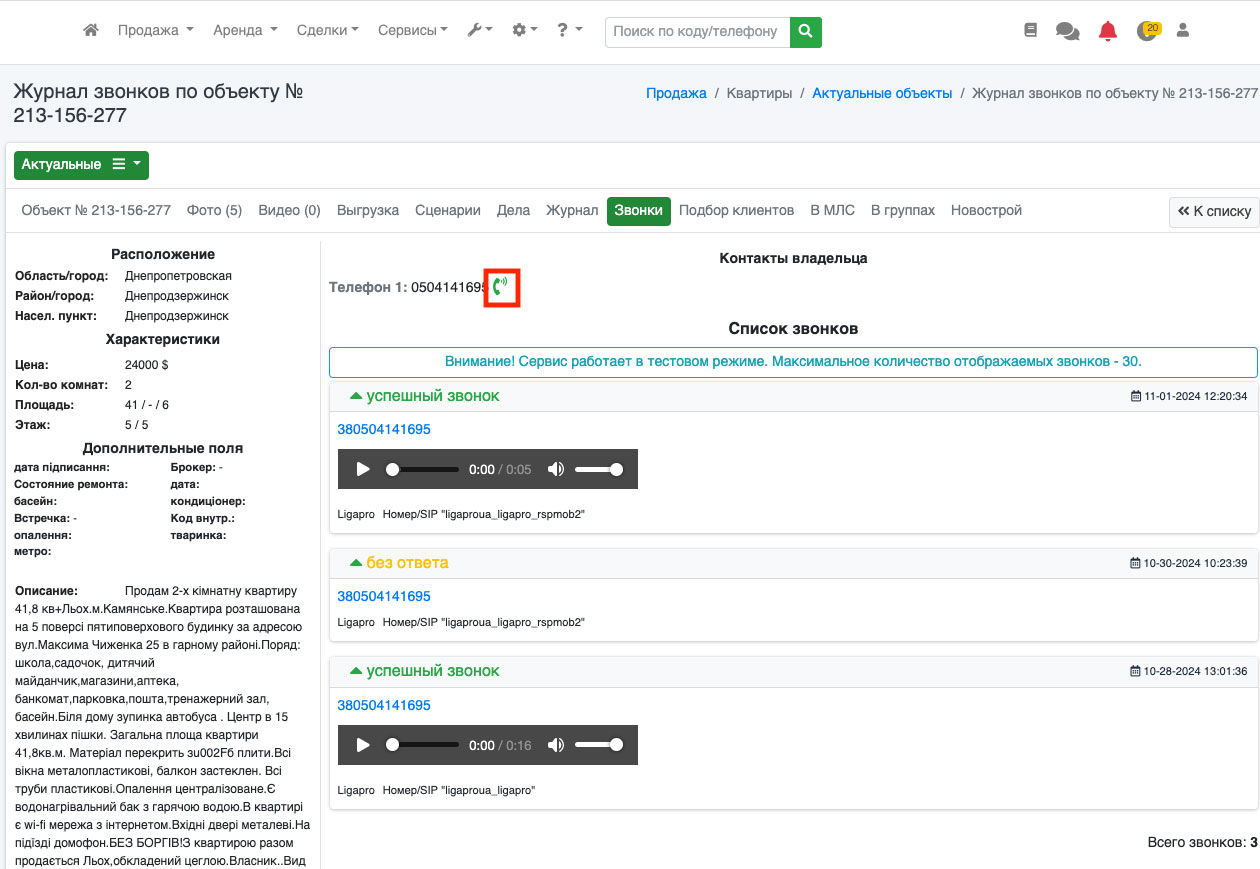 Дзвінки із CRM LigaPro зі сторінки редагування об'єкта
