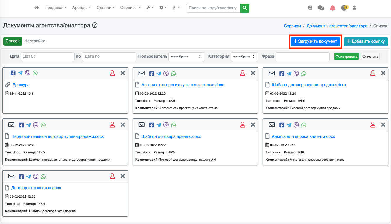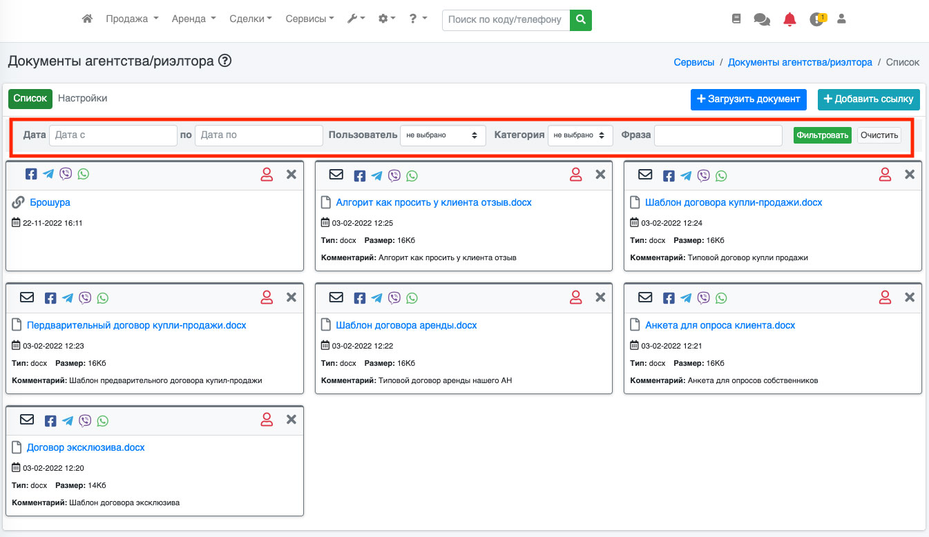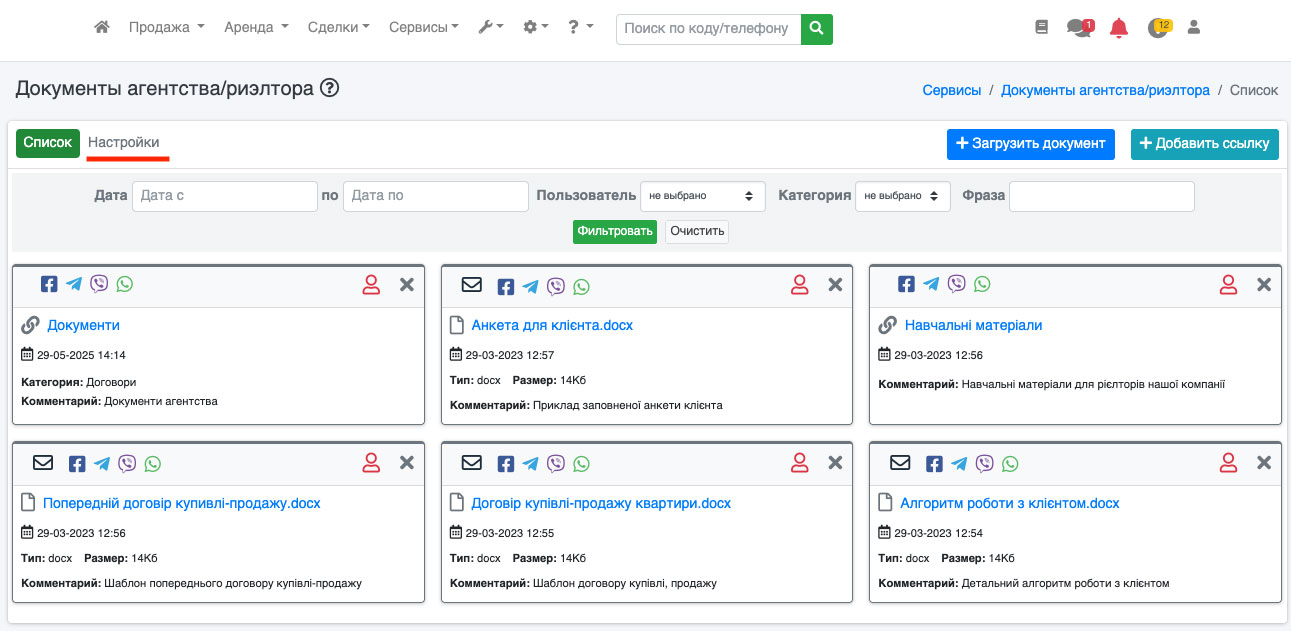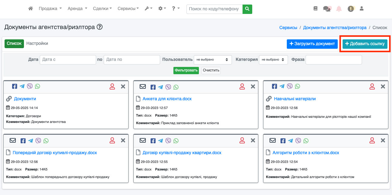 Даний розділ призначений для зберігання документів агентства або ріелтора (Рис. 280). Максимальний обсяг файлу для завантаження складає 5Мб. Також передбачена можливість завантажувати посилання на інші інтернет-ресурси, наприклад на Google Диск. Таким чином у цьому сервісі Ви можете зібрати всю необхідну інформацію, яка може знадобитися користувачам системи.